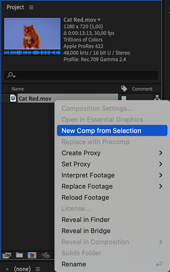 Import your video file into the project panel and right-click on it. Select “New Comp from Selection” to start working with it.
