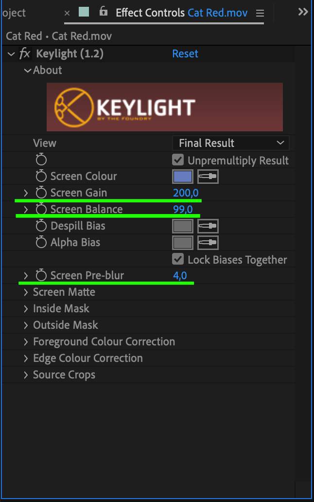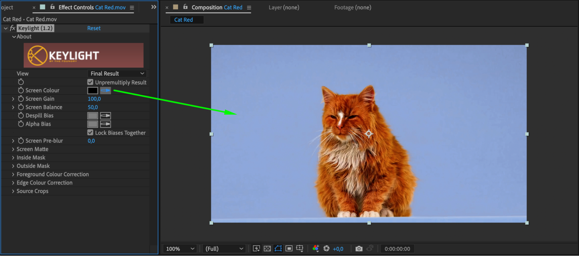 In the effect controls panel, you’ll find various settings for the Keylight effect. Use the eyedropper tool to select a part of the background you want to remove. Adjust settings like “Screen Gain,” “Screen Balance,” and “Screen Pre-blur” to fine-tune the keying effect and remove unwanted parts of the background.