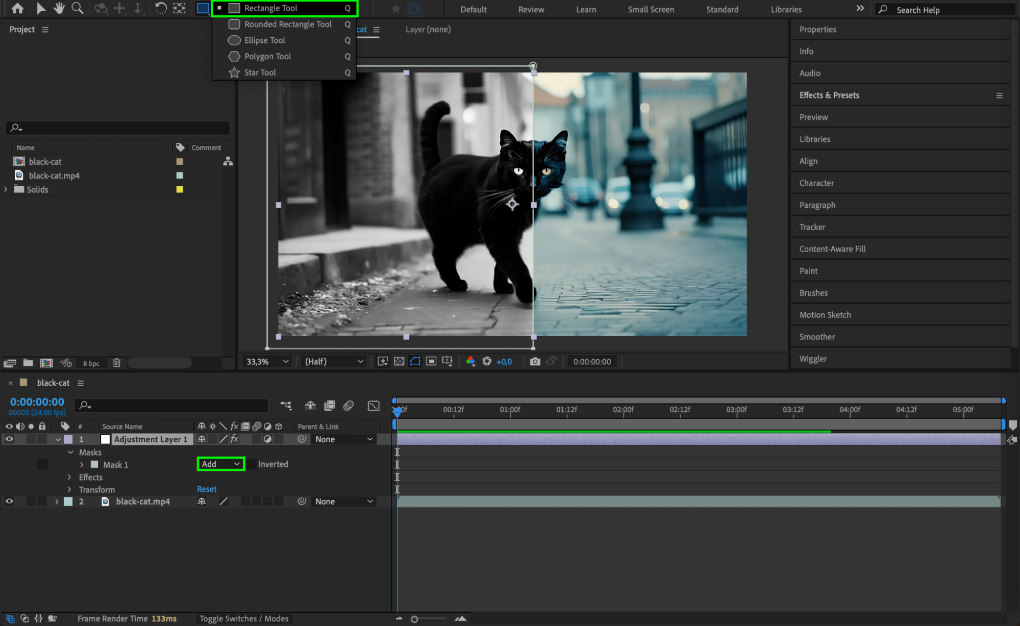 To control where the effect appears, select the Rectangle Tool (Q) from the toolbar and draw a mask on the adjustment layer. Position the mask over the area where you want the effect to be visible. In the mask settings, choose “Add” to make the effect visible within the mask area or “Subtract” to make the effect visible outside the mask area.