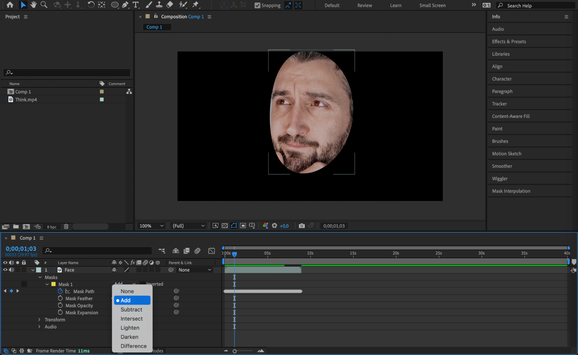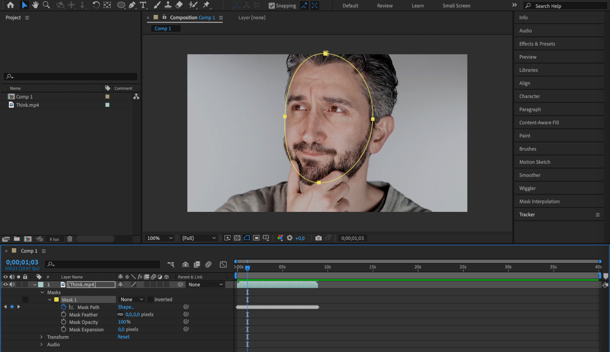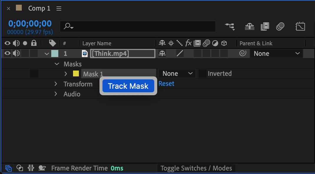 You can also create a mask around an object and track its movement. To do this, right-click on the created mask and select Track Mask from the submenu. The Tracker panel will appear, and you need to press the Play button to start the tracking process. Keyframes for the Mask Path property will be automatically created as the mask follows the object. Once the tracking is complete, you can experiment with the tracked mask. For example, you can track a person’s face and apply a mask to add special effects only to their facial features.