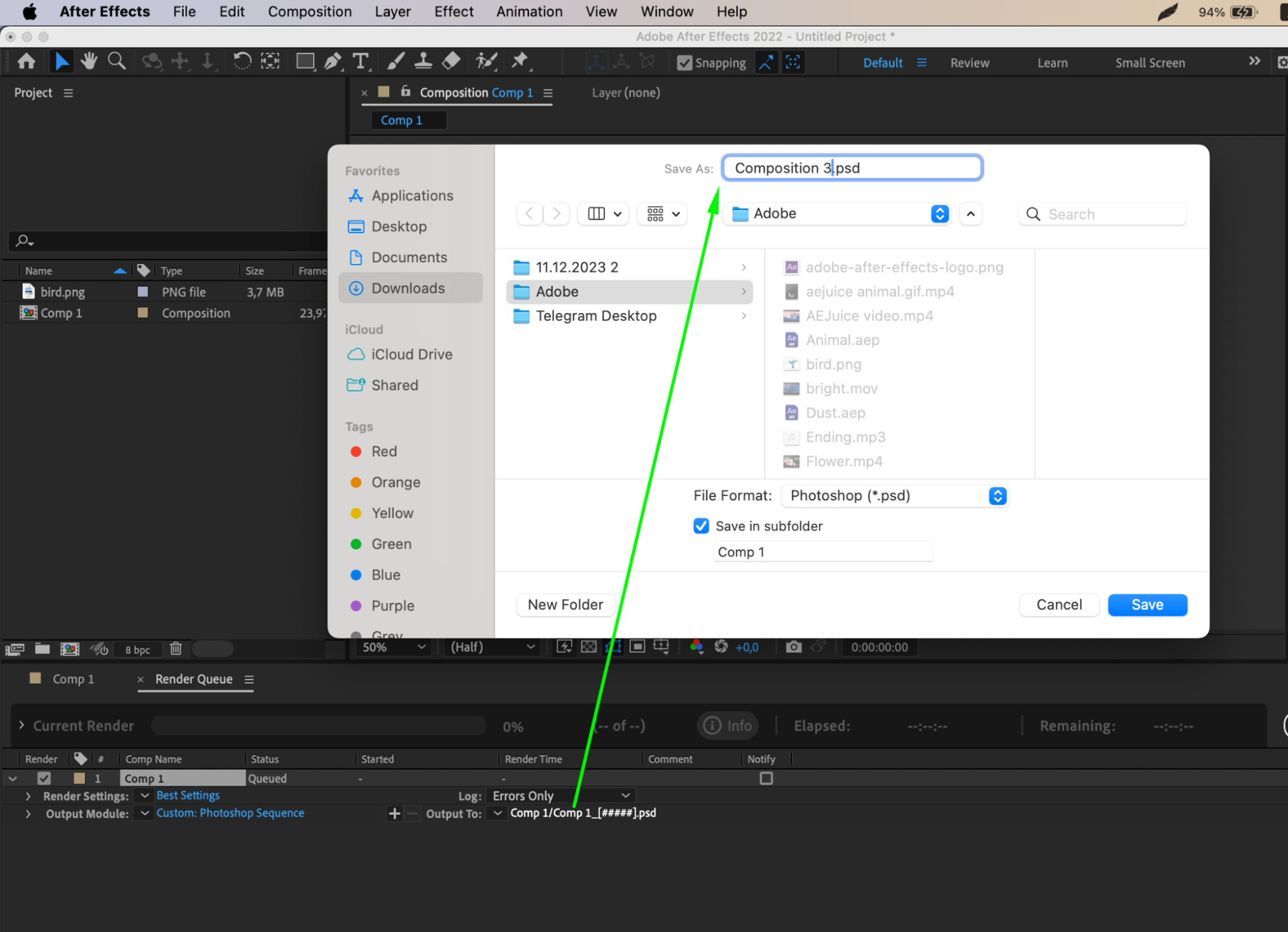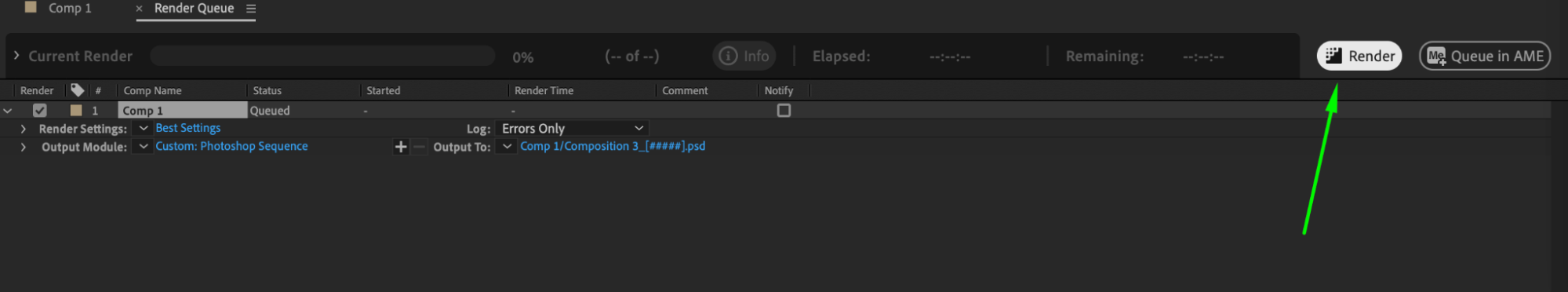 1. Use the Photoshop Sequence format: When saving a file in the “Photoshop Sequence” format in After Effects, it is essential to use the Render Queue for exporting. This format represents a series of static images crafted in After Effects, saved in a Photoshop-compatible format. It empowers the preservation of each composition frame as an individual layer, offering valuable flexibility for additional enhancements in Photoshop.