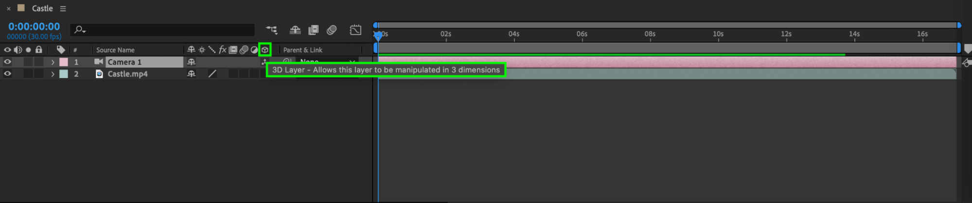 Next, enable the 3D option for your video layer to utilize the camera tool effectively. Click the cube icon next to your video layer in the “Timeline” panel to enable the 3D layer.