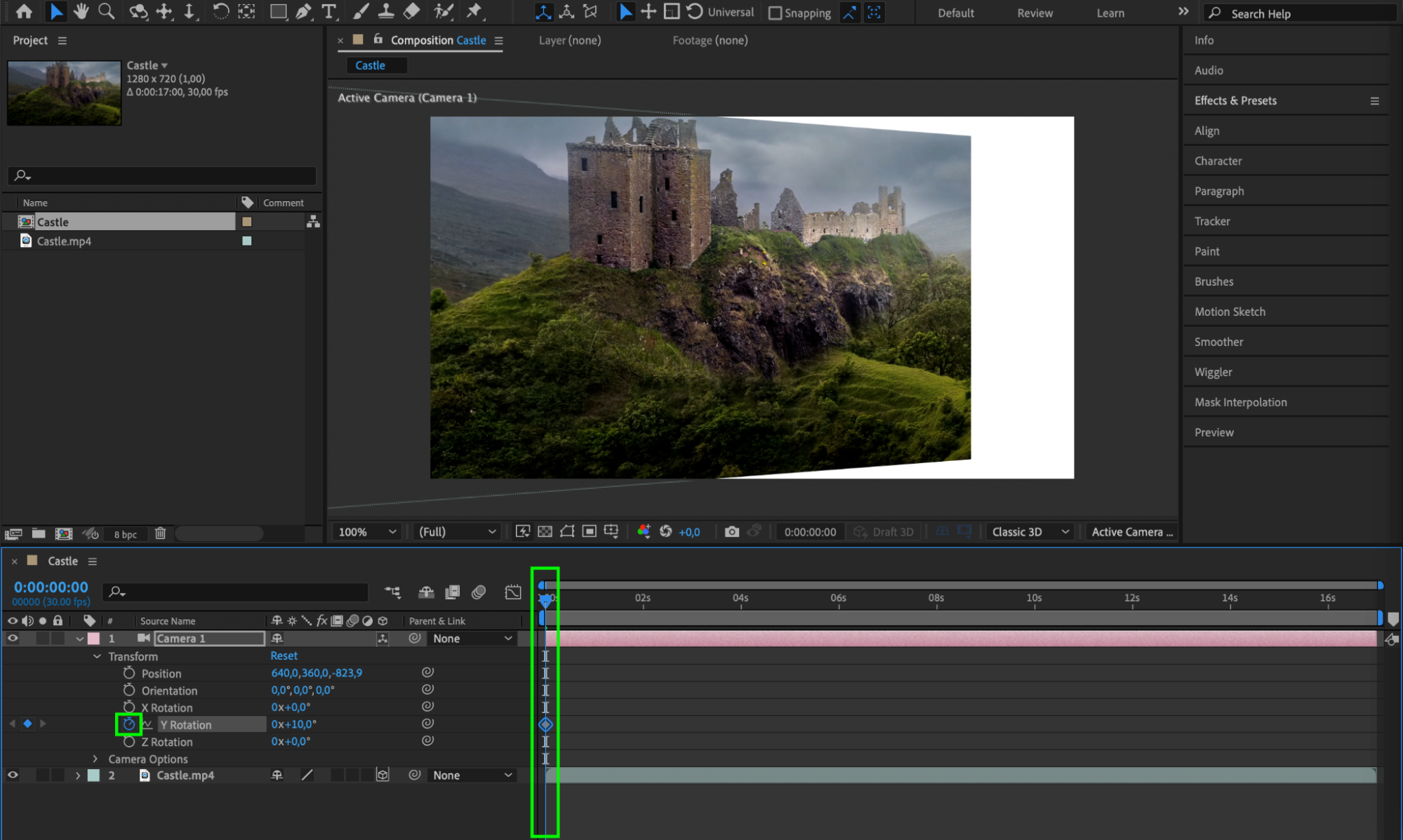 To create the panning effect, you’ll need to animate the Y rotation property. At the start of your video layer, set a keyframe for “Y Rotation”. Move to the end of the layer and set another keyframe with a different Y rotation value to simulate smooth camera movement.