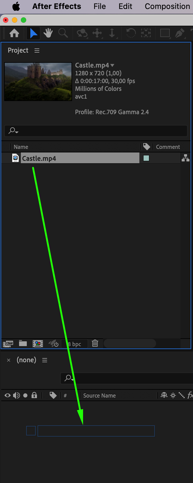First, open After Effects and import your video file. To do this, click on “File” -> “Import” -> “File”, select your video, and click “Import”. Then drag the video from the “Project” panel to the “Timeline” panel to start working with it.
