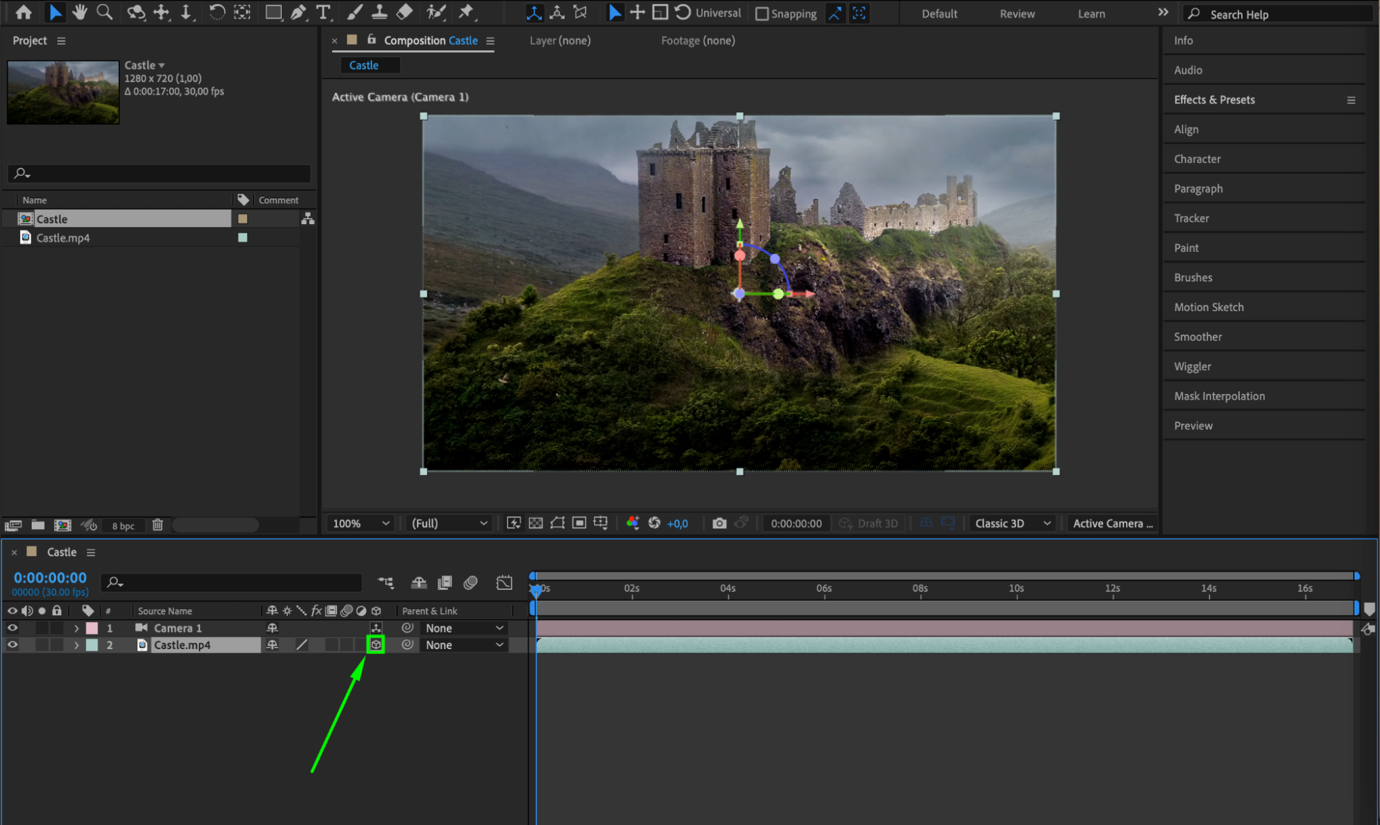 Next, enable the 3D option for your video layer to utilize the camera tool effectively. Click the cube icon next to your video layer in the “Timeline” panel to enable the 3D layer.