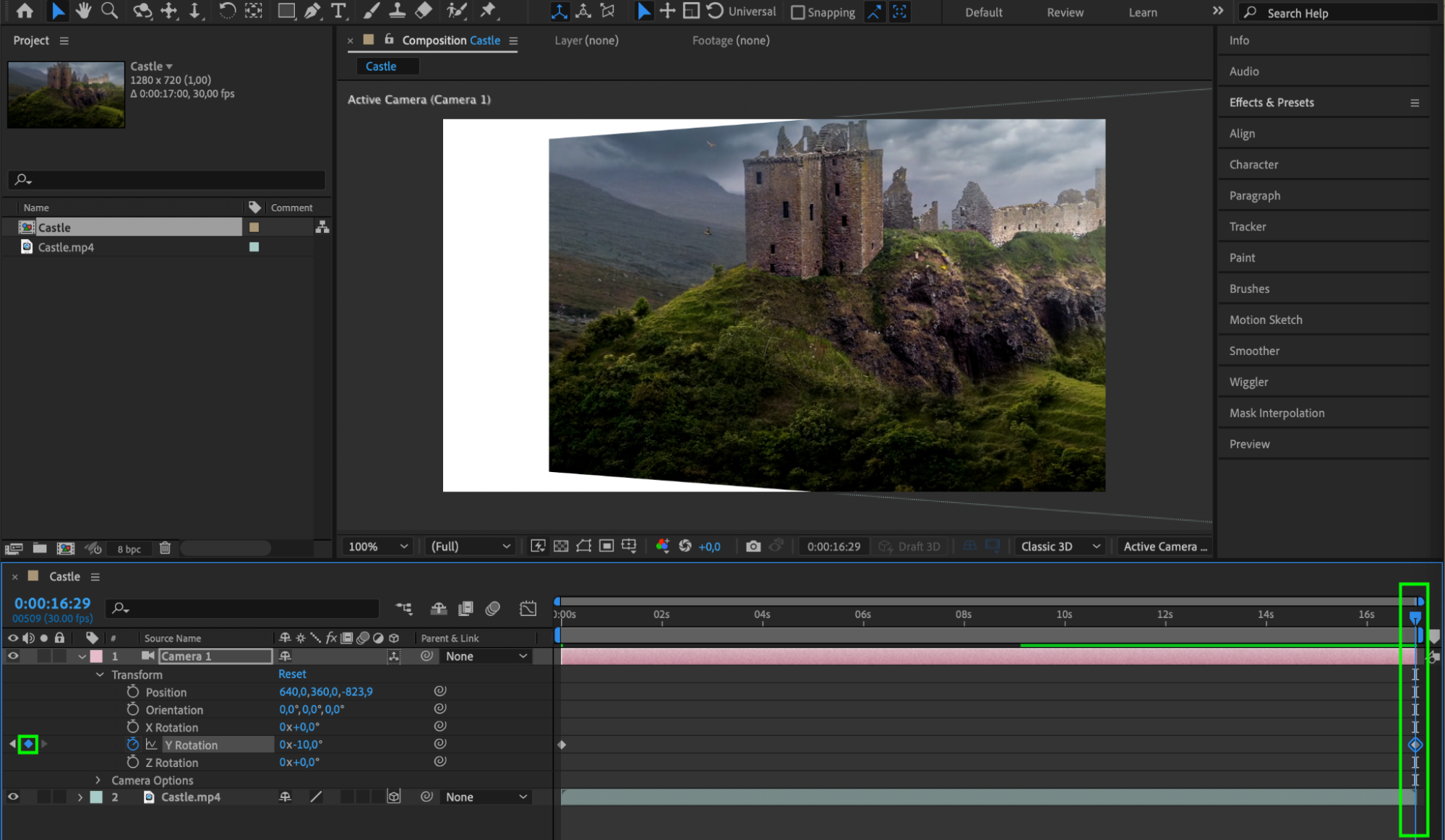 To create the panning effect, you’ll need to animate the Y rotation property. At the start of your video layer, set a keyframe for “Y Rotation”. Move to the end of the layer and set another keyframe with a different Y rotation value to simulate smooth camera movement.