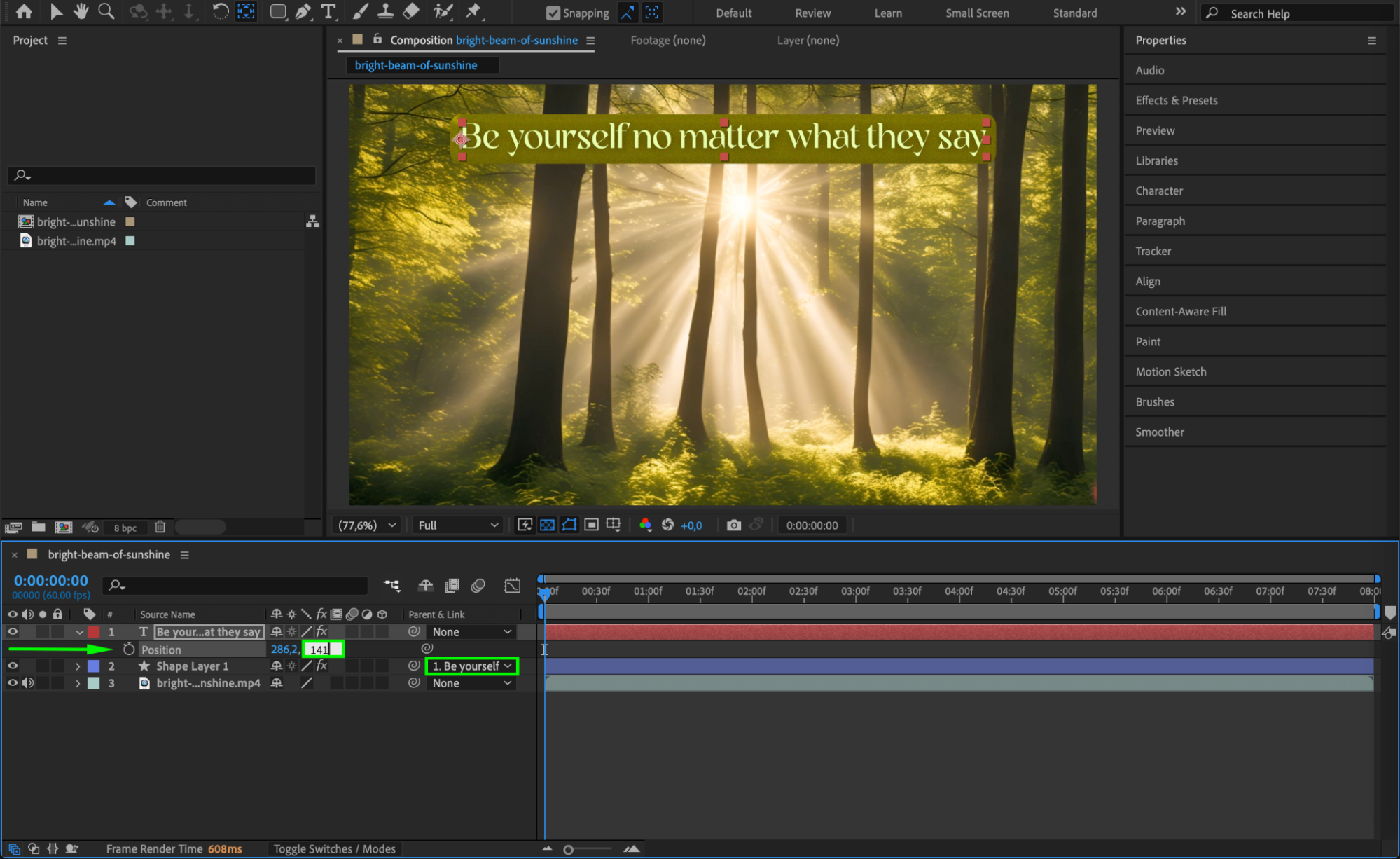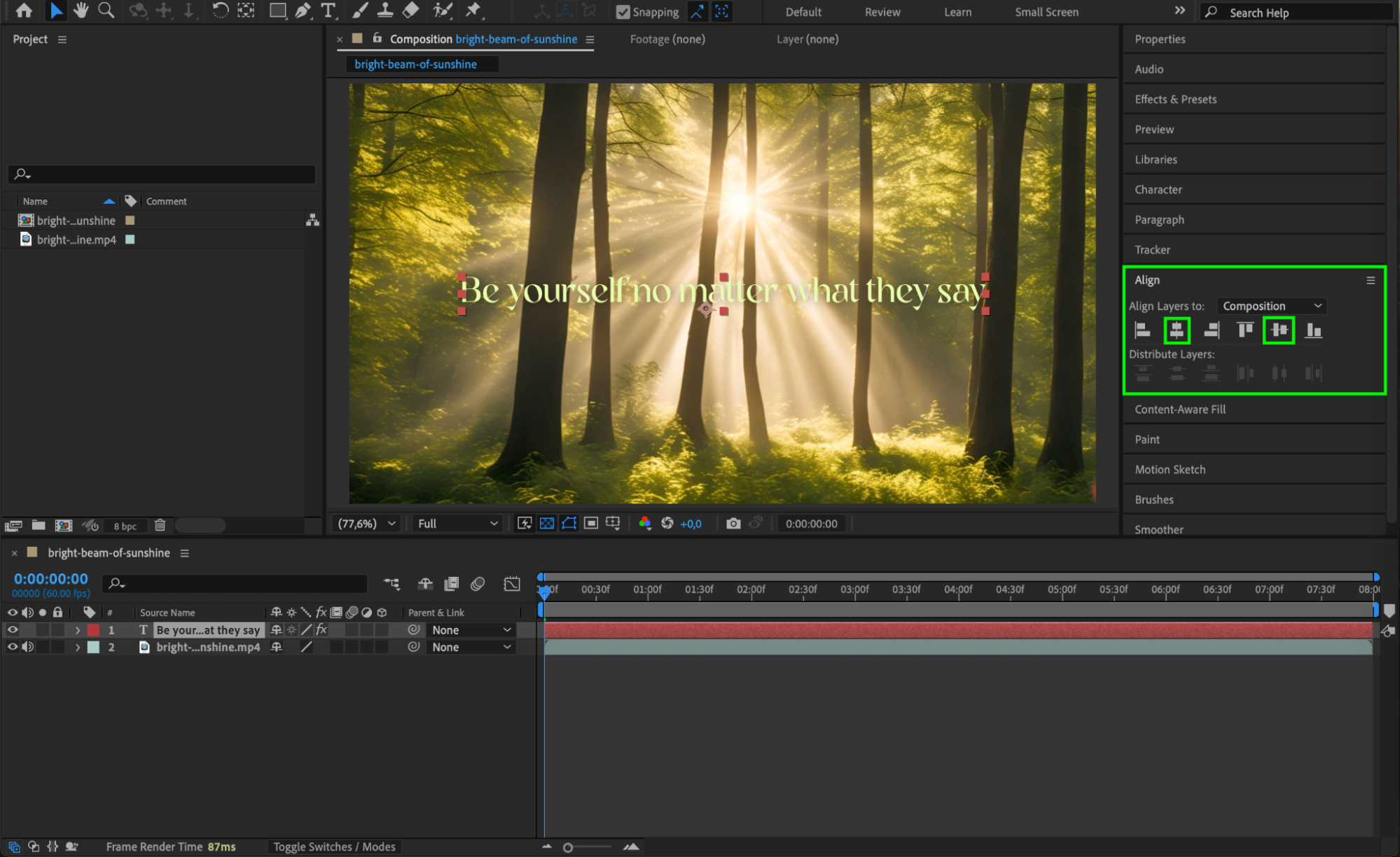 Open the Align panel by going to Window > Align. With your text layer selected, you can instantly center the title horizontally, vertically, or both. This tool is useful if you want the title to be in the center of the screen or evenly spaced within the composition.