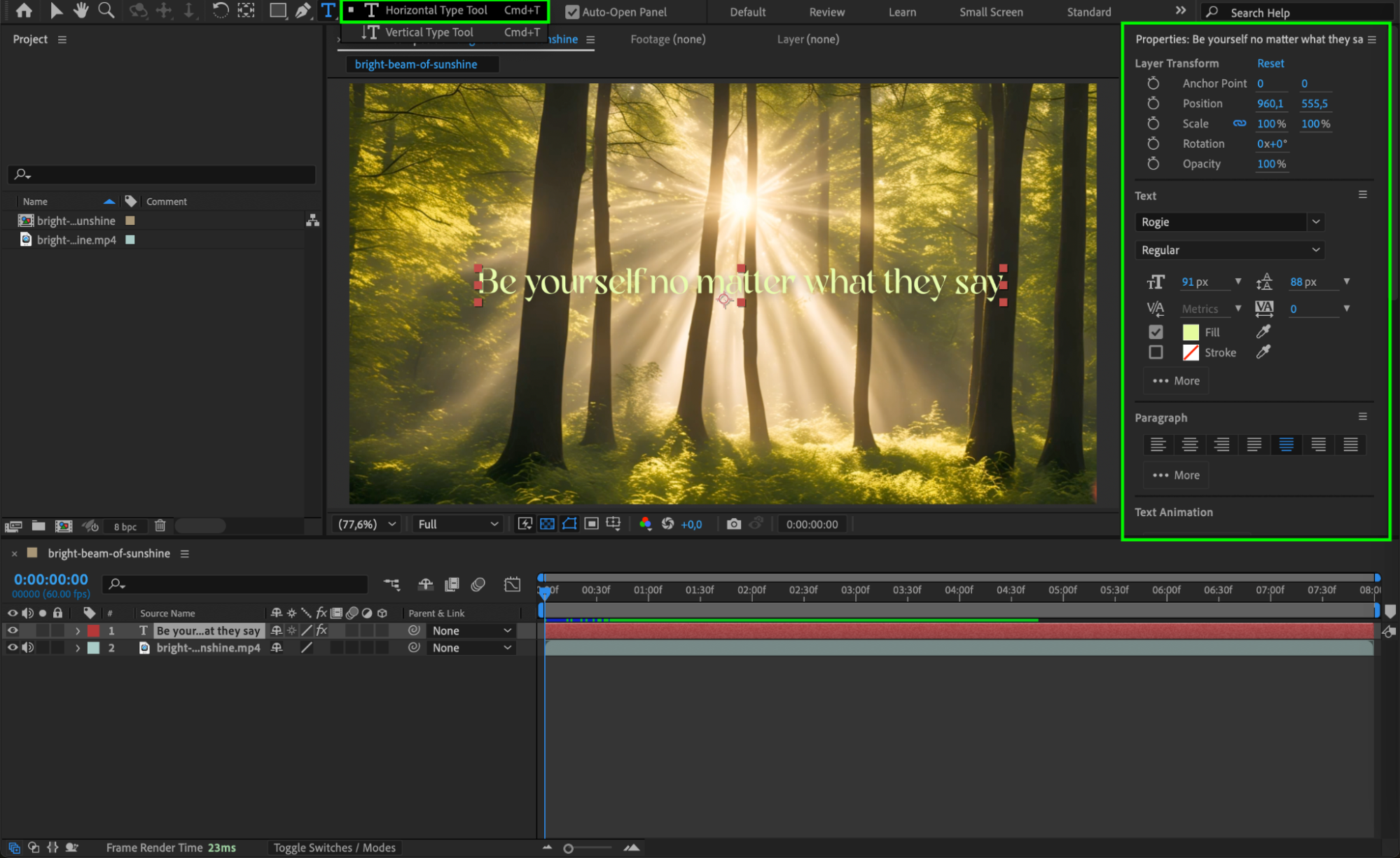 Start by going to Composition > New Composition and setting your desired resolution and duration or open your project. Then use the Type Tool (Ctrl/Cmd + T) to create your title. You can either click once to create point text or click and drag to define a paragraph text box, which is helpful if you want the text to stay within a set width.