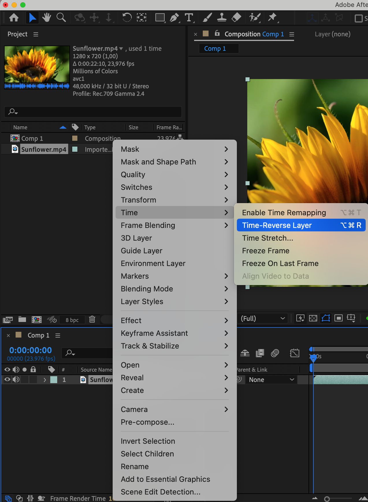Right-click on your video layer and from the submenu, select Time > Time-reverse layer. Your layer will automatically become a video layer with the Time Reverse applied.