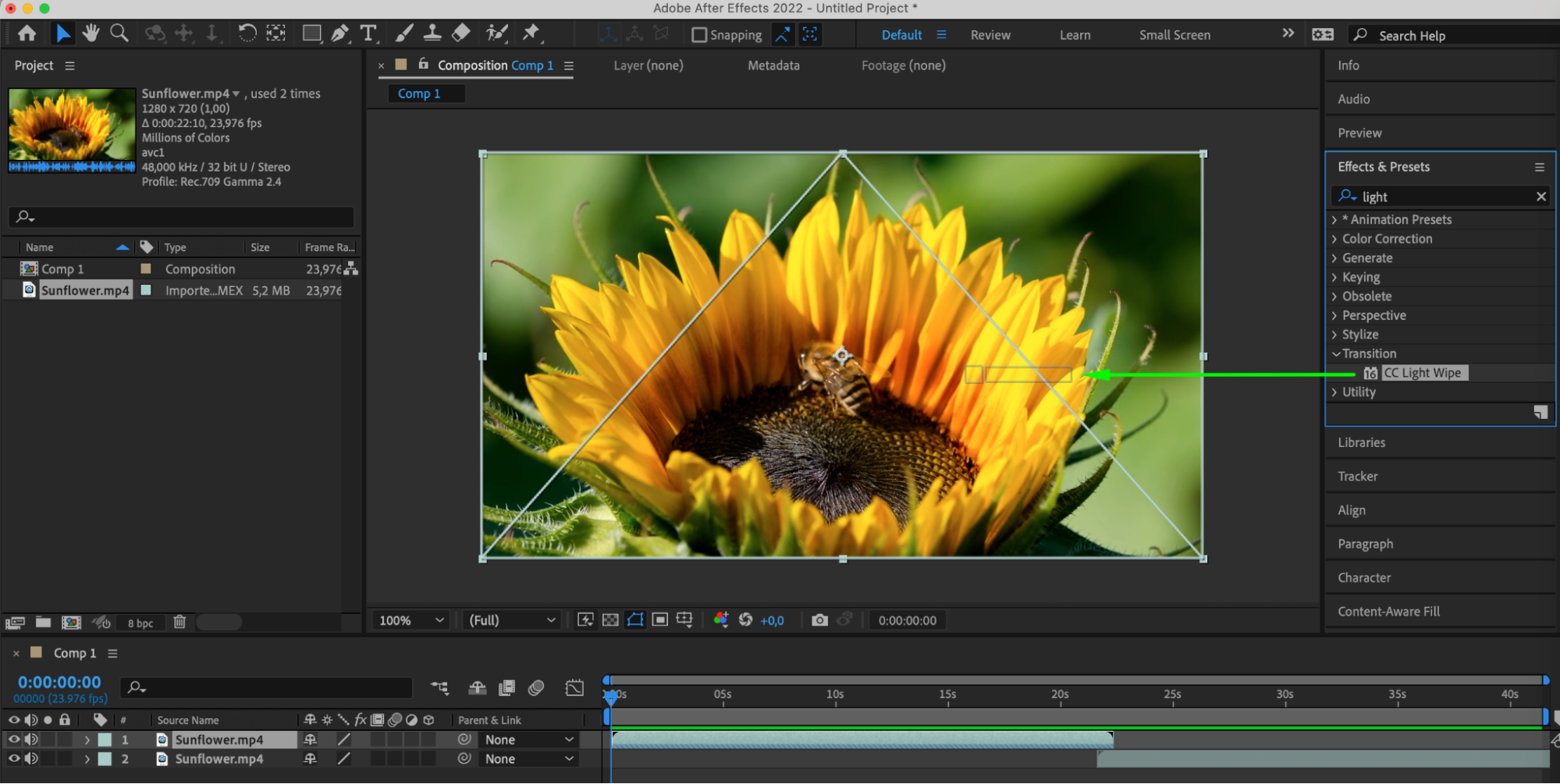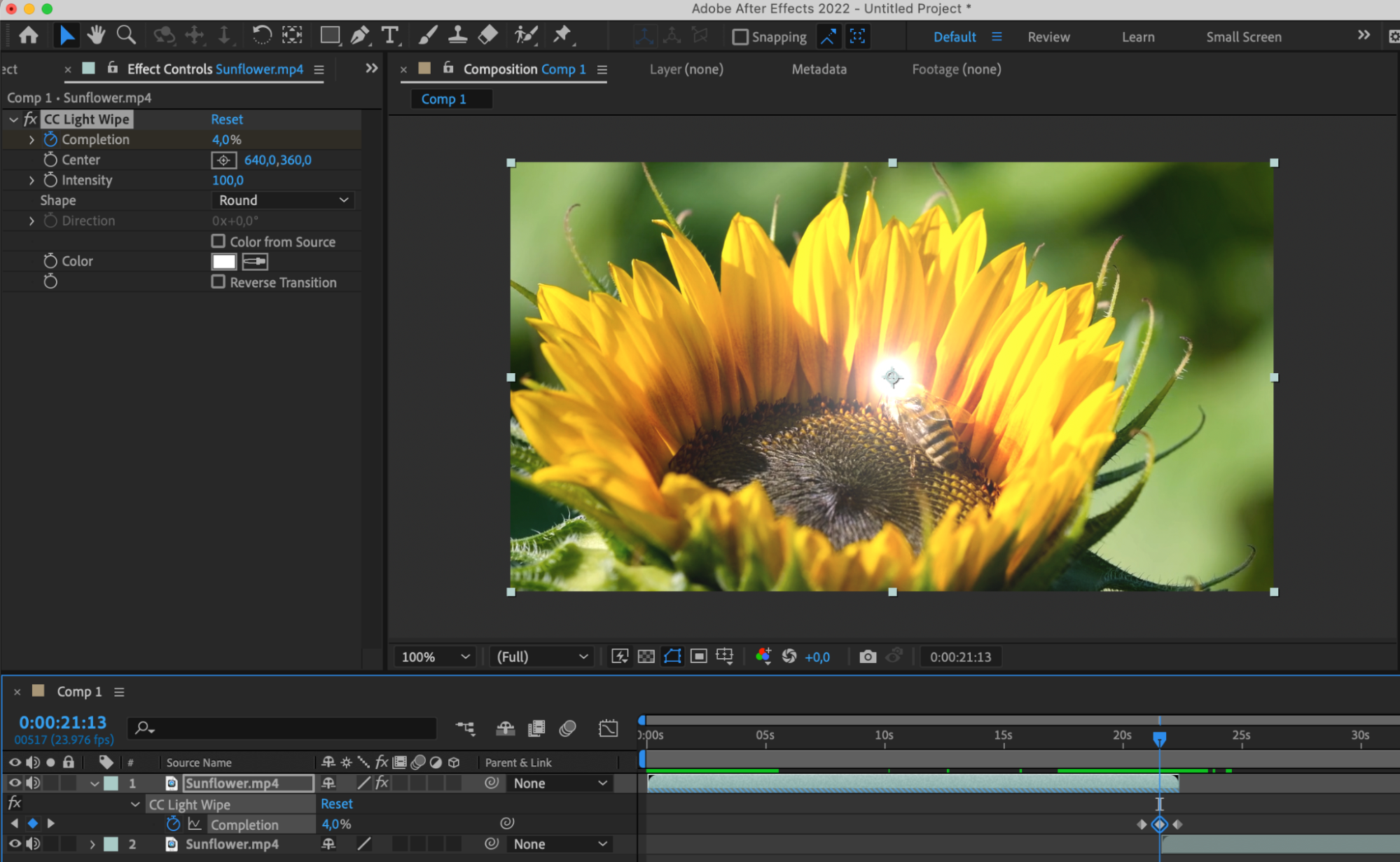 You can enhance the reversed video by adding effects or overlays to make it more interesting and impactful. Add various transition effects between the reversed and original footage (drag the original video from the project panel onto the composition panel and place this layer before or after the reversed layer), such as blurs, distortions, or flickers, to create smooth and unique transitions.