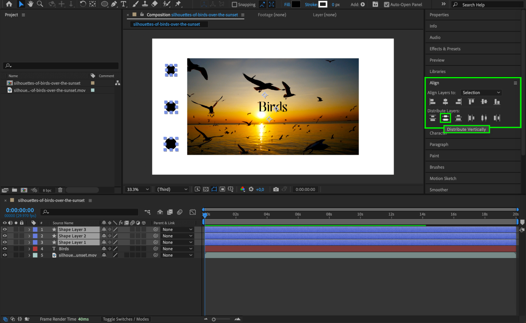 If you need to space multiple layers evenly, use the Distribute options in the Align panel. These buttons let you evenly distribute layers horizontally or vertically, ensuring consistent spacing. This technique is especially helpful for maintaining a clean and organized layout in your composition.
