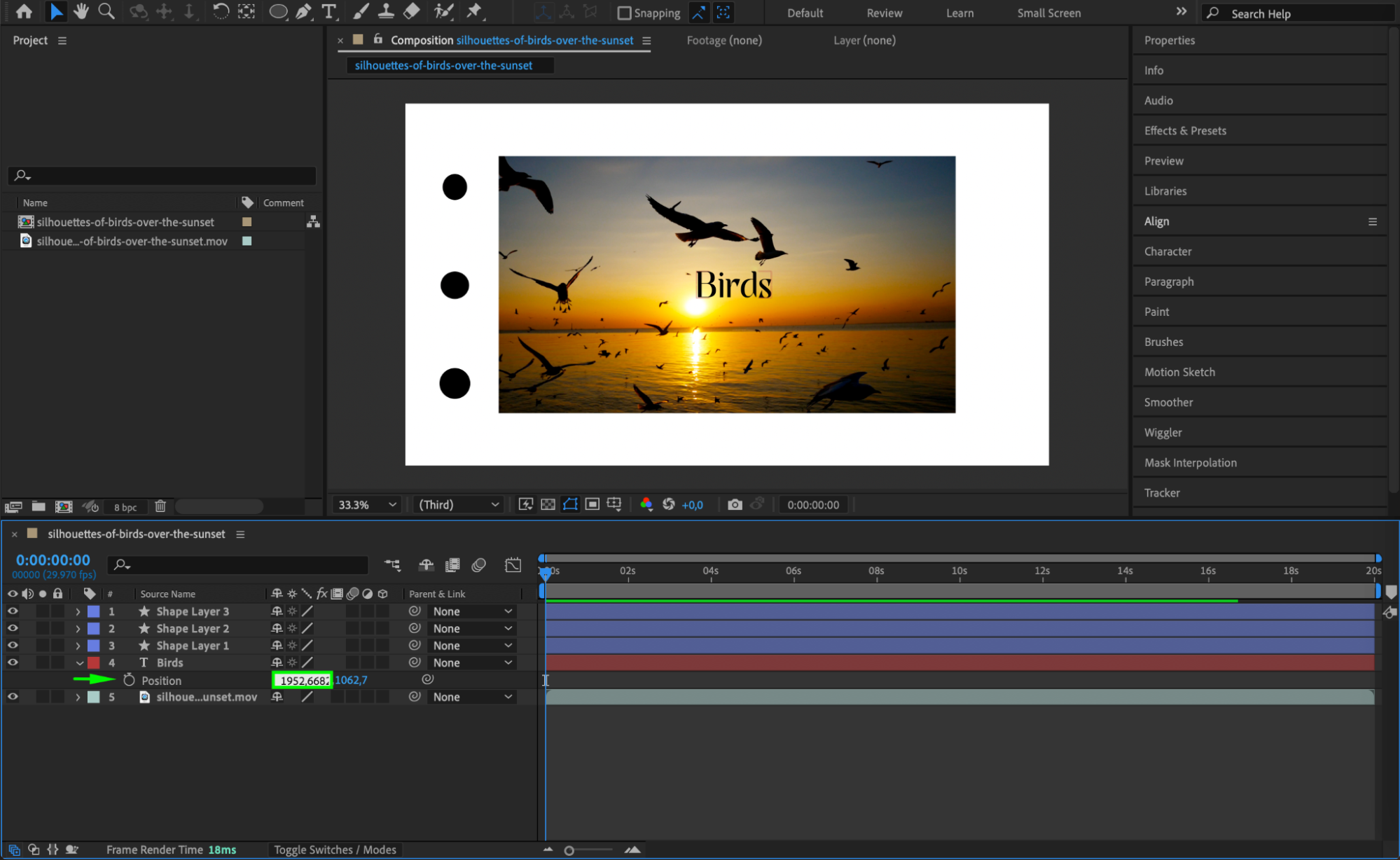After aligning your layers, you may want to make small adjustments to their positions. Select a layer and press “P” to open the Position property, where you can enter specific values to fine-tune placement. This gives you more control and precision in positioning each layer.