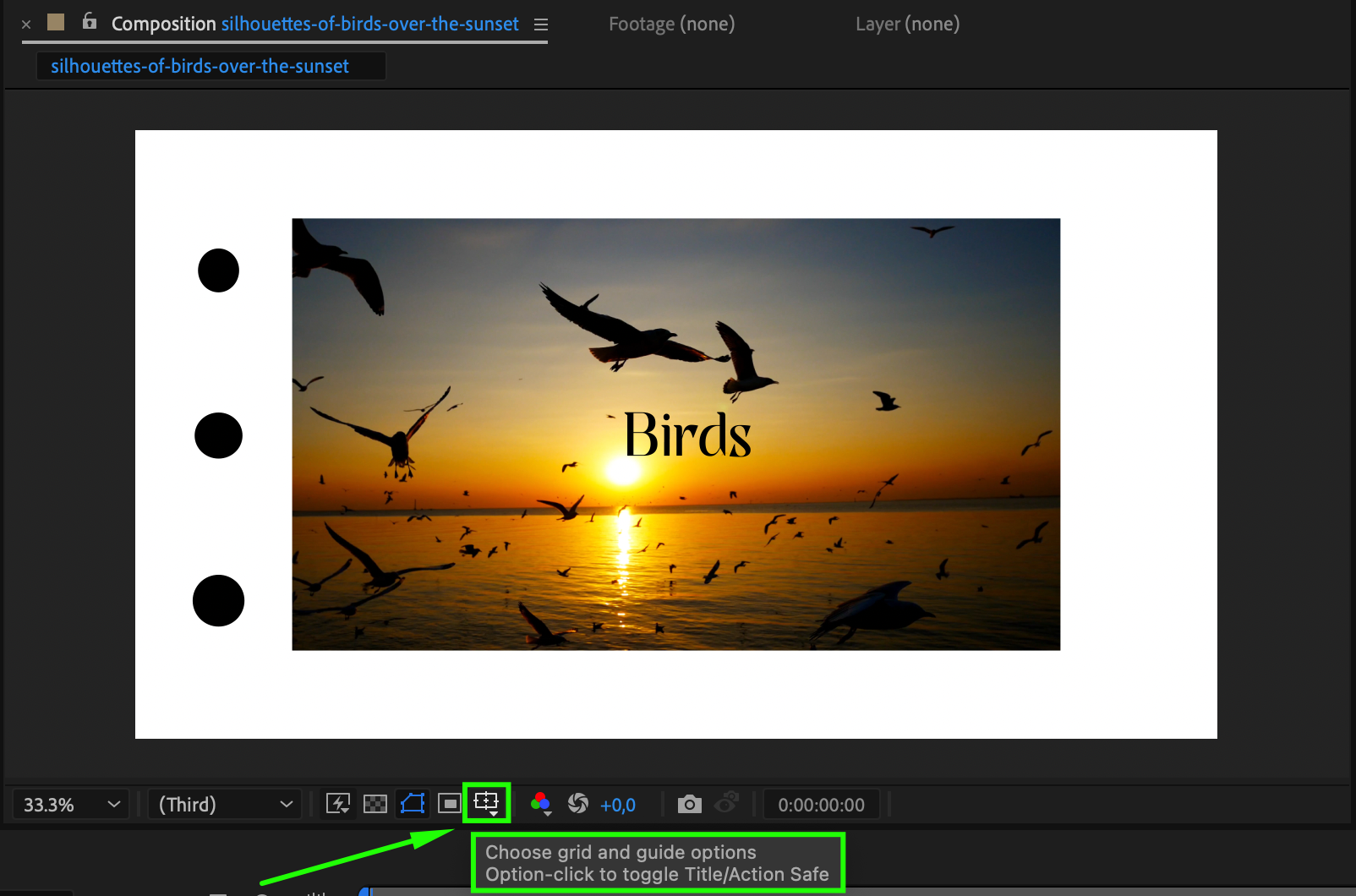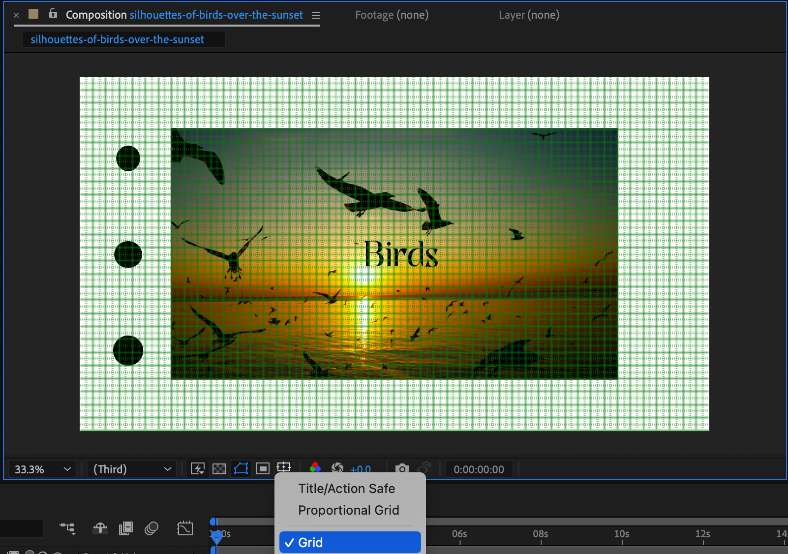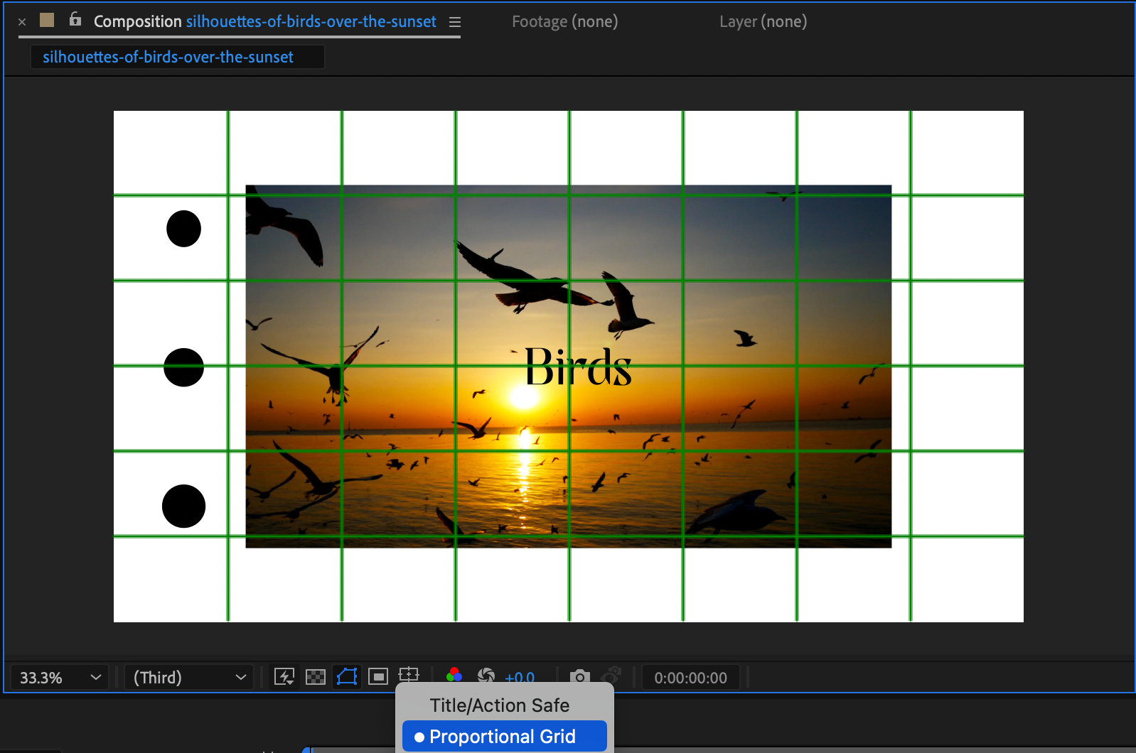 For additional precision, enable the grid by clicking the grid icon at the bottom of the Composition panel. Choose between the Proportional Grid or the main Grid to help align layers with equal spacing and symmetry, ensuring professional results.