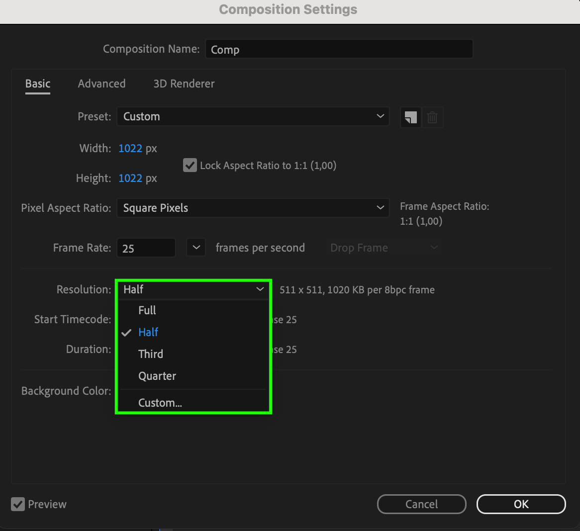 First, determine how large your GIF should be. The smaller the resolution, the smaller the file size. In the “Composition” menu, select “Composition Settings” and set your desired resolution. For example, setting the resolution to “half” or “quarter” can significantly reduce the GIF file size while maintaining acceptable image quality.