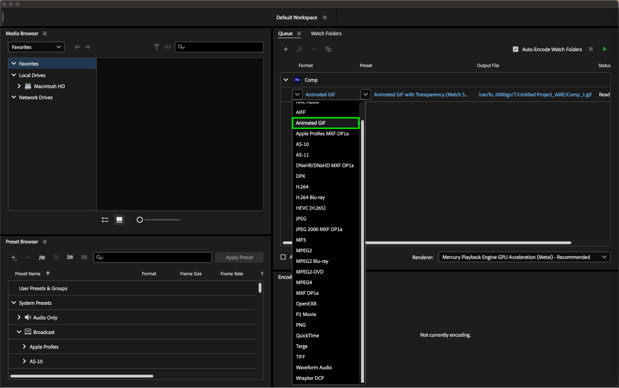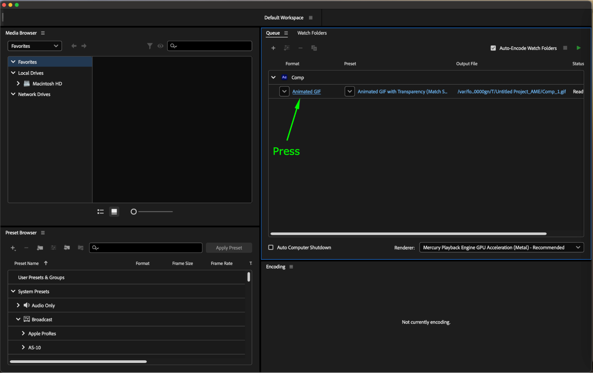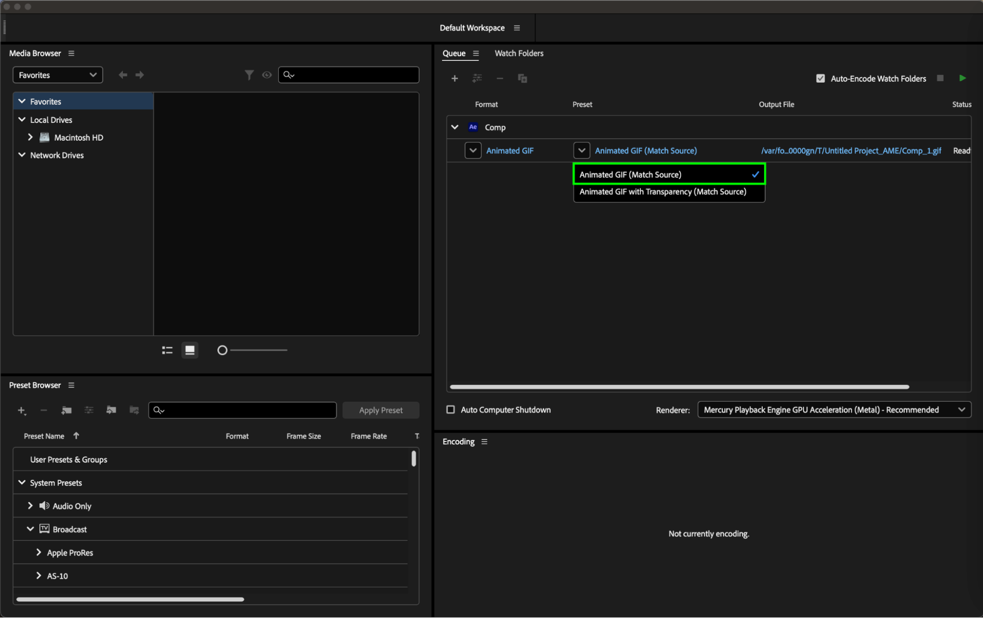 Once you’ve adjusted all export settings, click the “Start Queue” button in the bottom of the Adobe Media Encoder window to begin encoding your composition into a GIF with the selected settings.