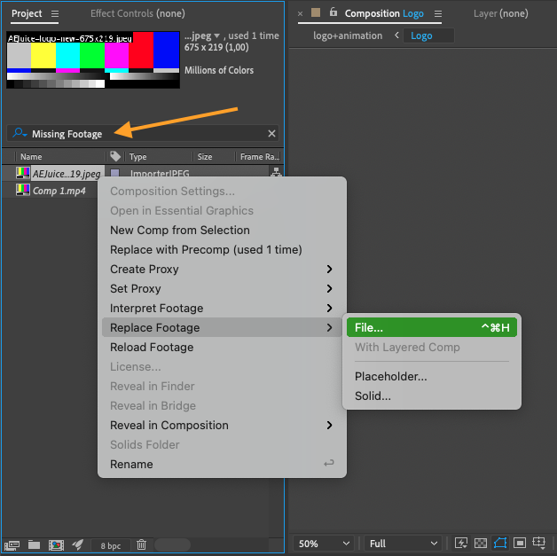 In the project panel, right-click on the missing file and select “Replace Footage > File.” Navigate to the location where you have stored the missing file and select it. After Effects will automatically replace the missing file with the new one.