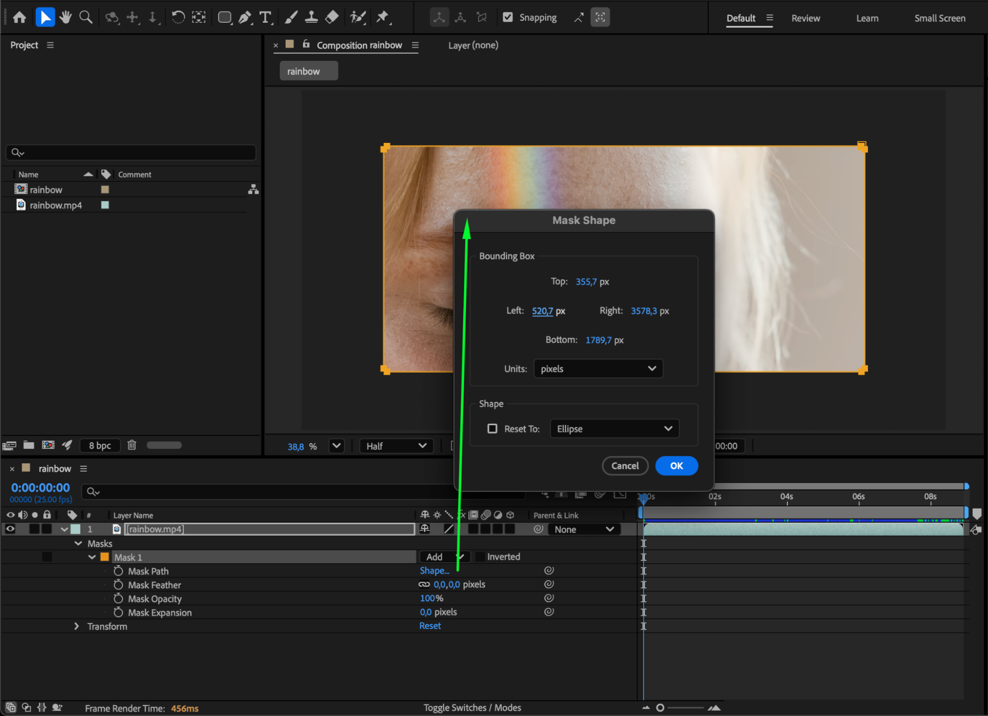 Next to Mask Path, click the shape icon. You can now adjust the mask’s size numerically or even convert it into an ellipse if needed for different effects.