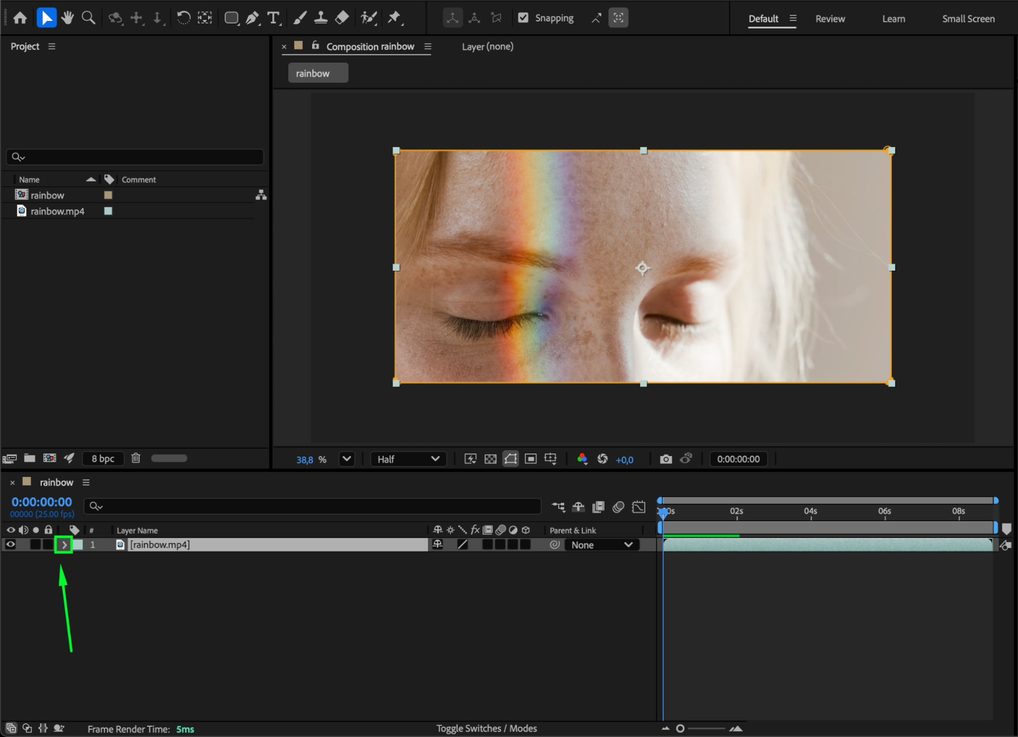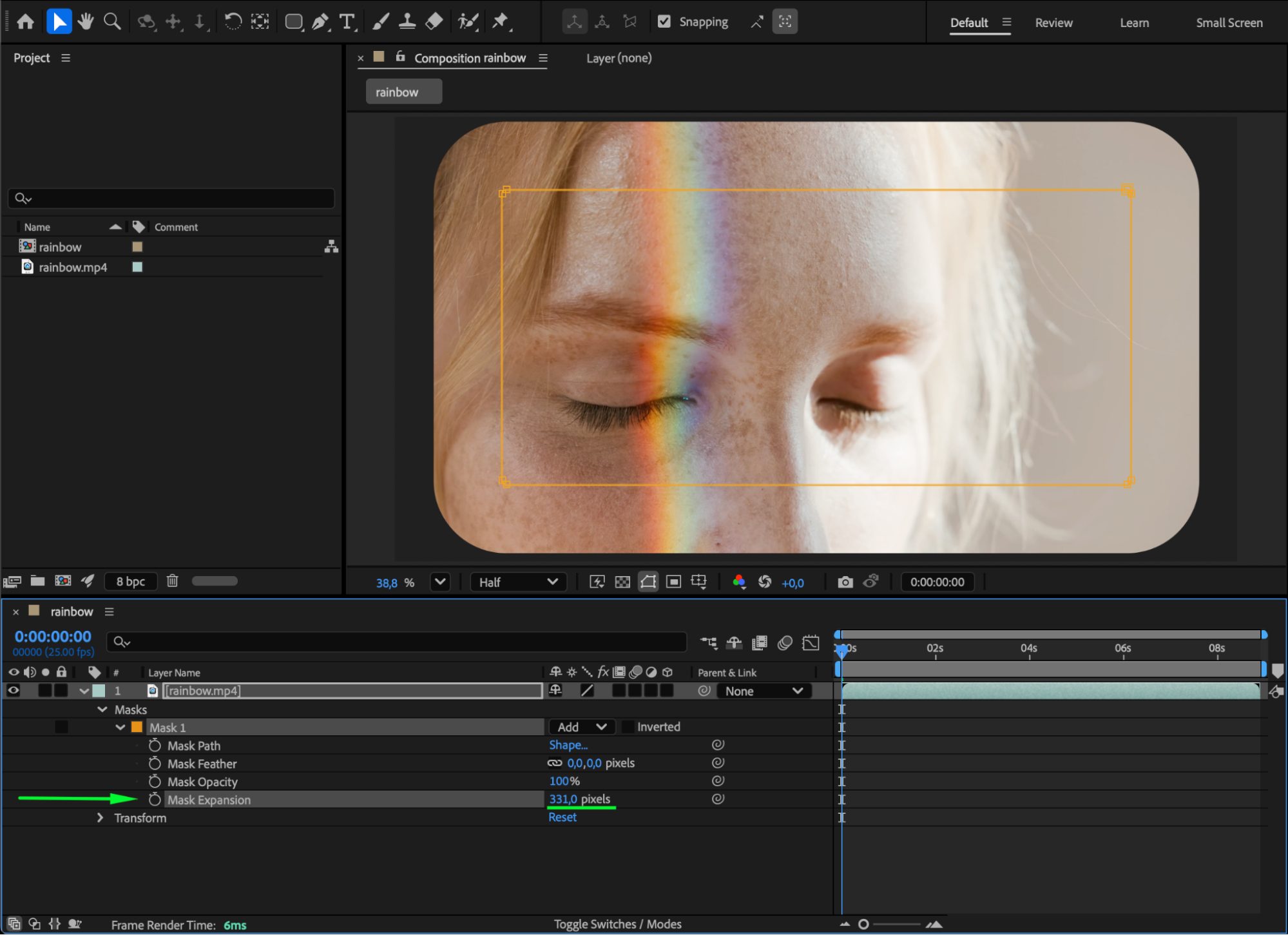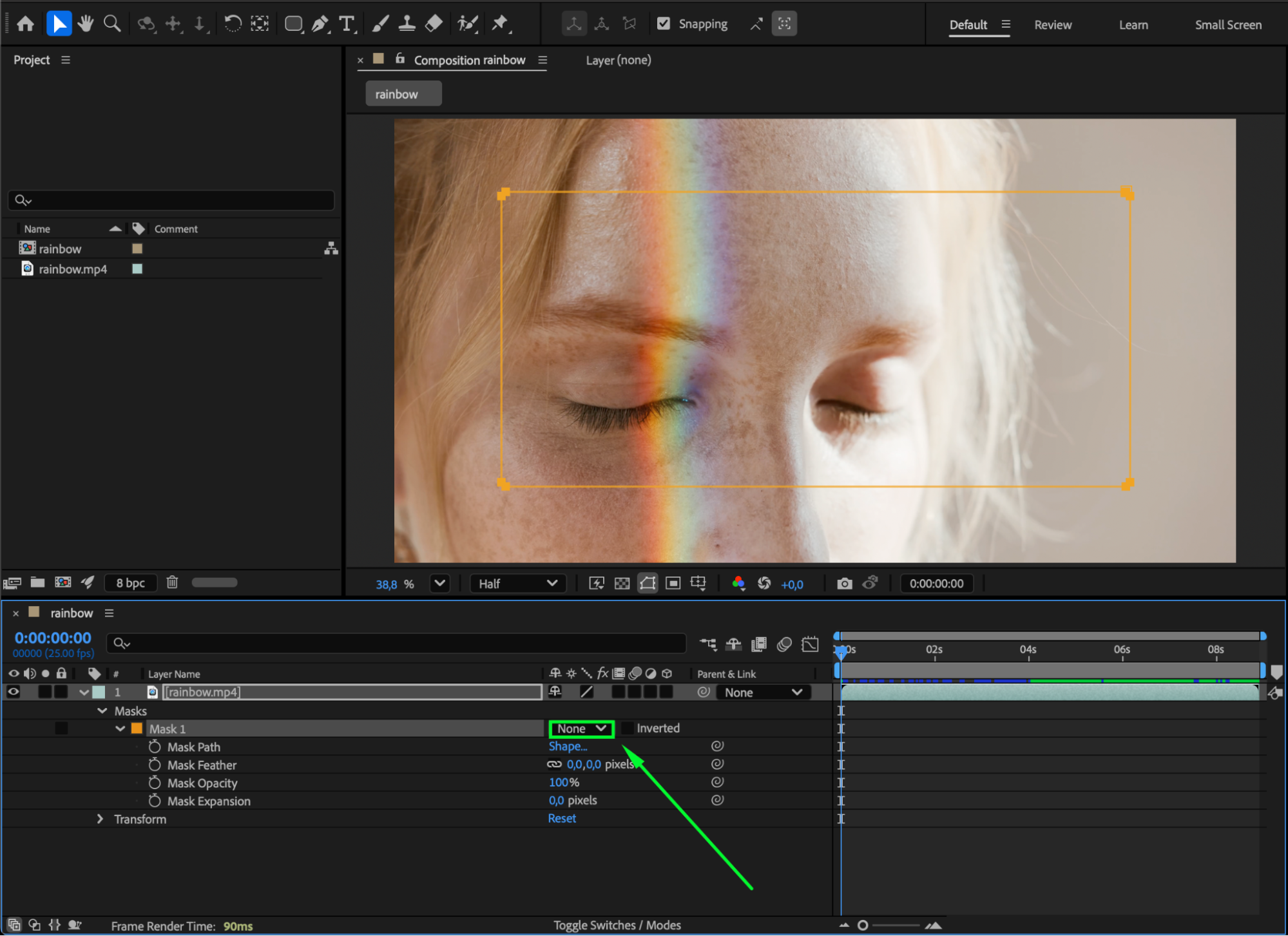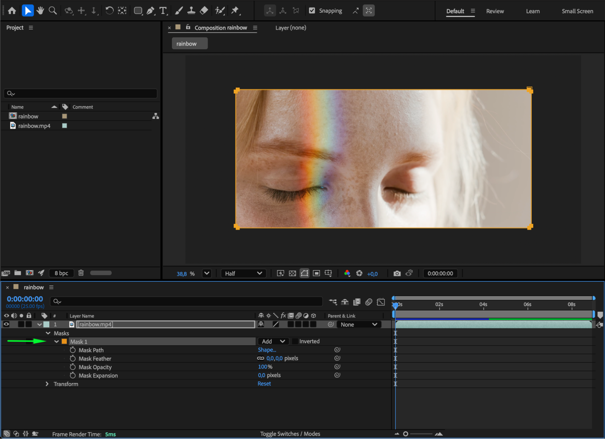 In the Timeline Panel, click on the layer that contains the rectangular mask. You’ll see a small dropdown arrow next to the layer name.