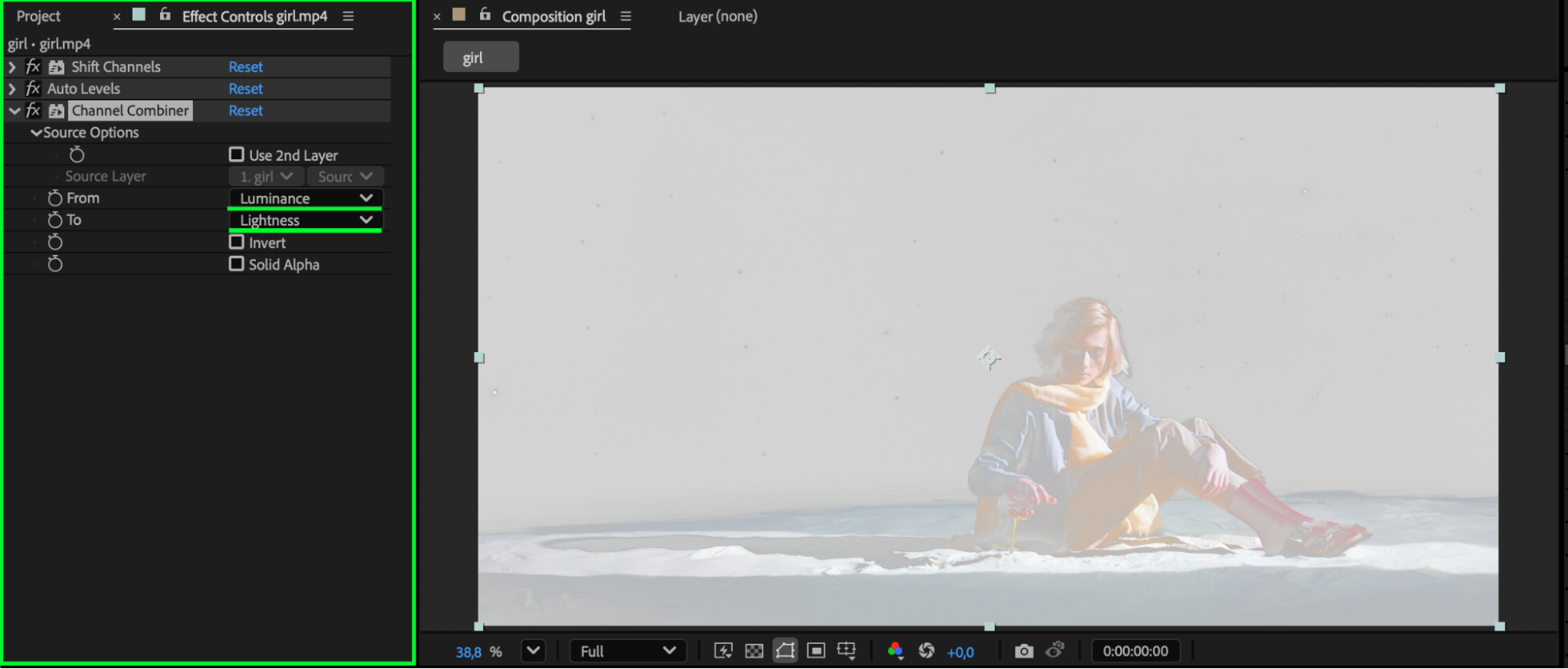 Duplicate your footage, apply Shift Channels, and set Take Alpha From → Luminance. Then refine the matte by applying Auto Levels and Channel Combiner (e.g., converting luminance to saturation) to better separate bright and dark regions. This method provides deeper control compared to simple keying.