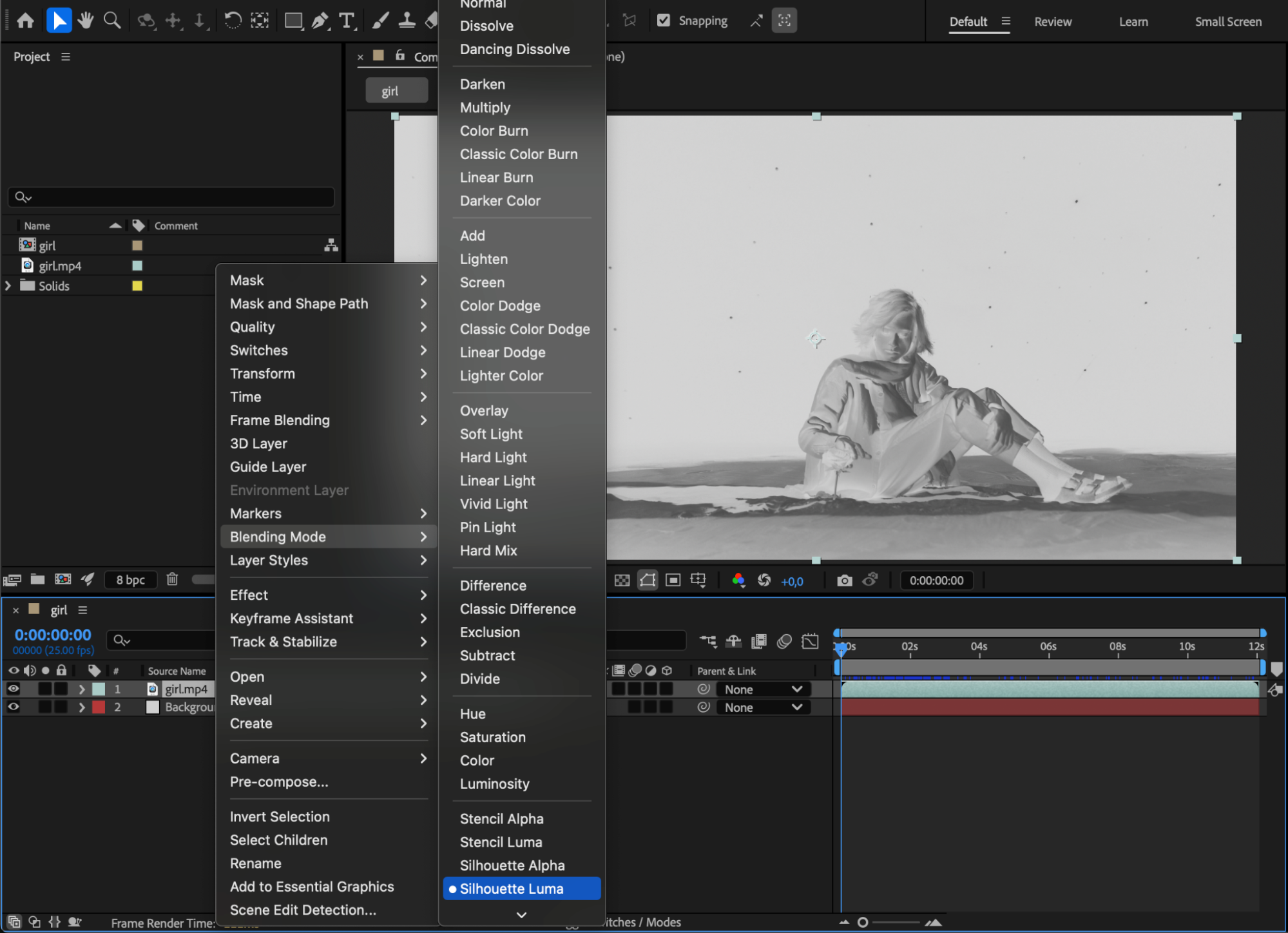 Place a white solid below your footage if needed, then select your layer and change the blend mode from Normal to Screen or Silhouette Luma. This instantly removes dark areas and keeps bright pixels visible, making it the quickest method for glows, flares, sparks, or any light-based elements.