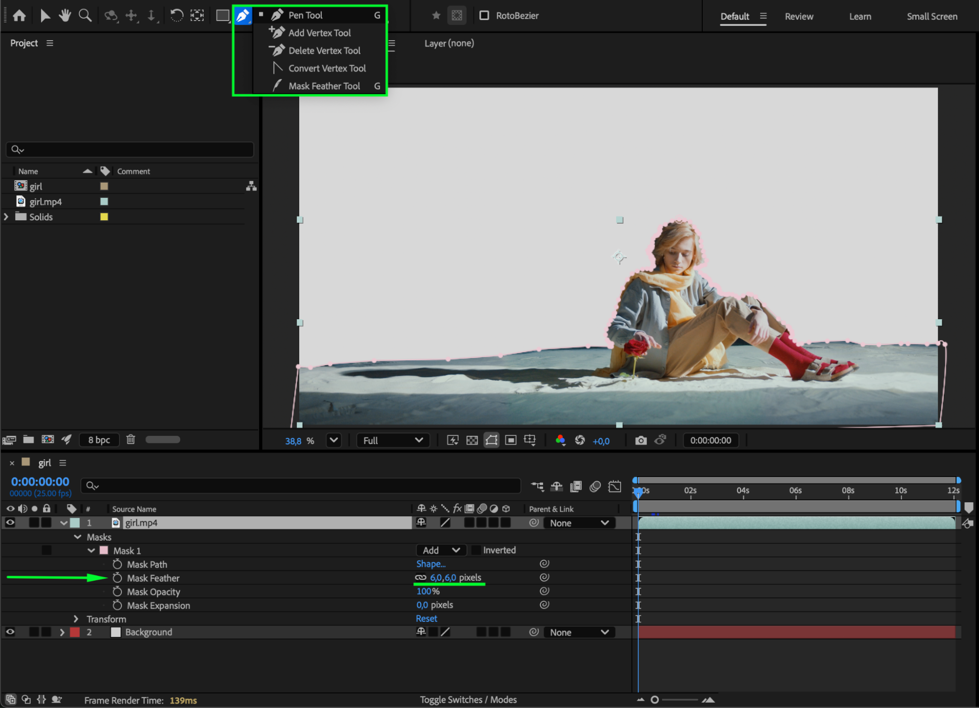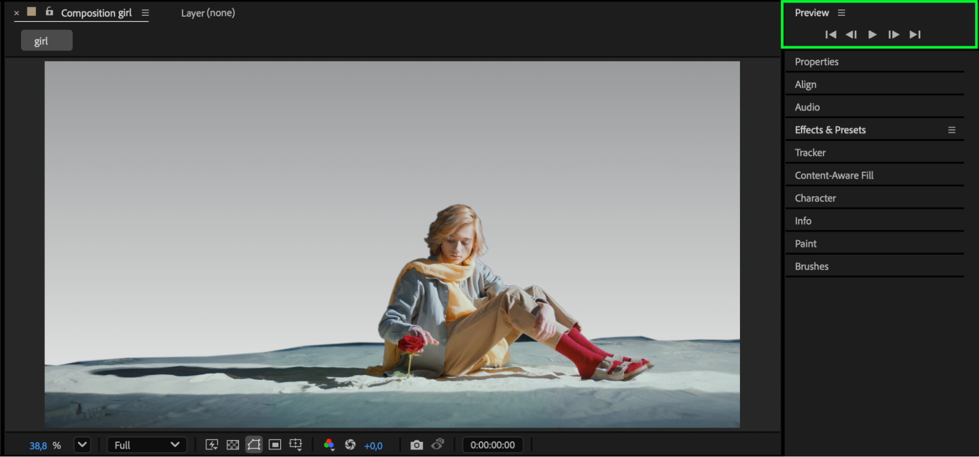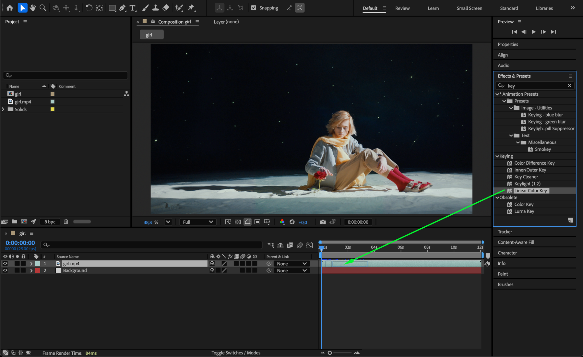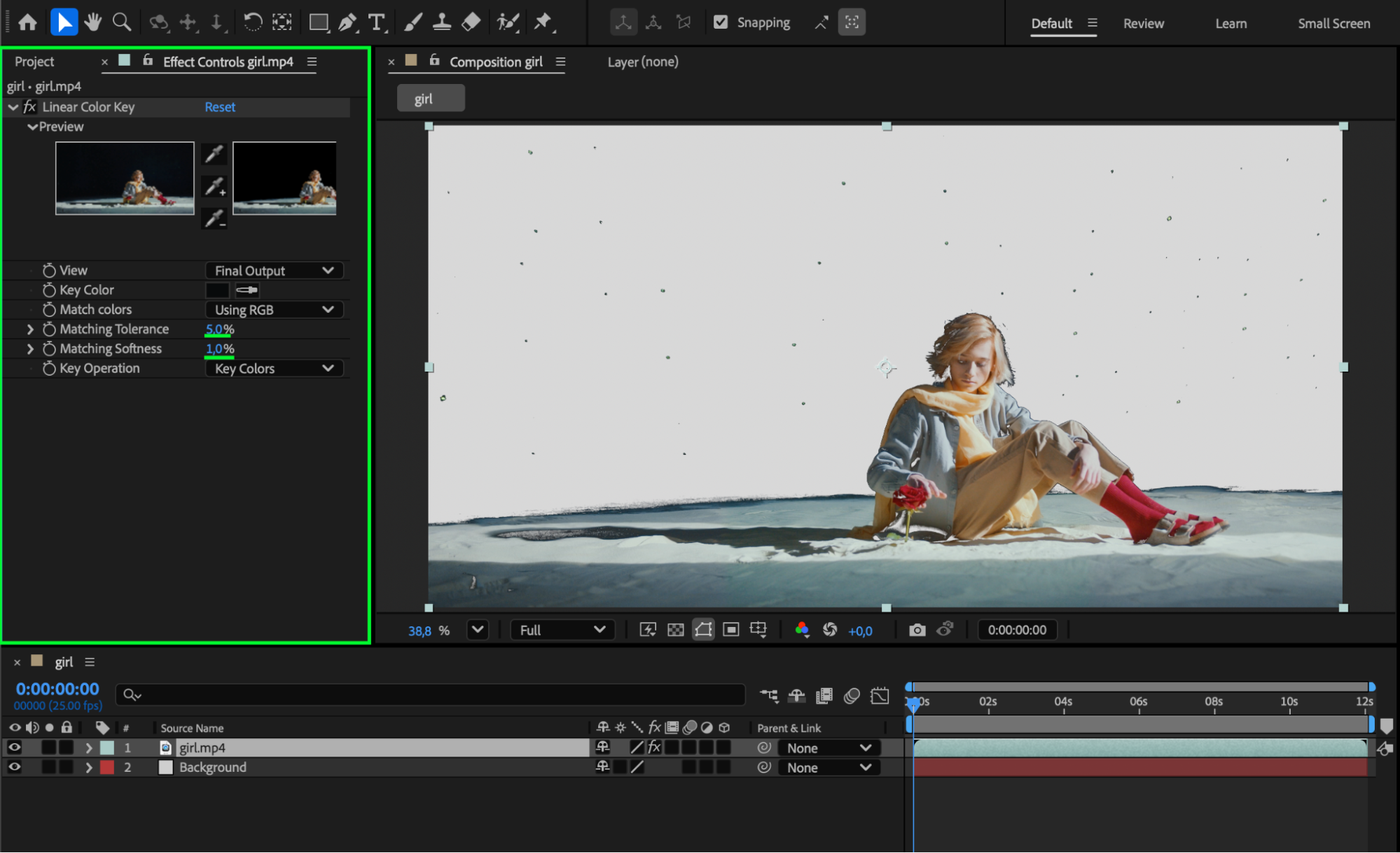 Press Spacebar to preview your composition and fine-tune blend modes, tolerance values, matte settings, or mask shapes to achieve the cleanest possible transparency.