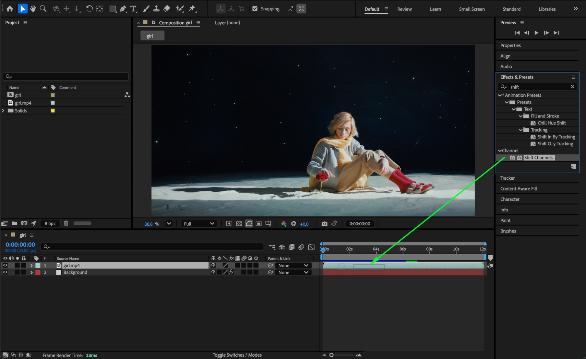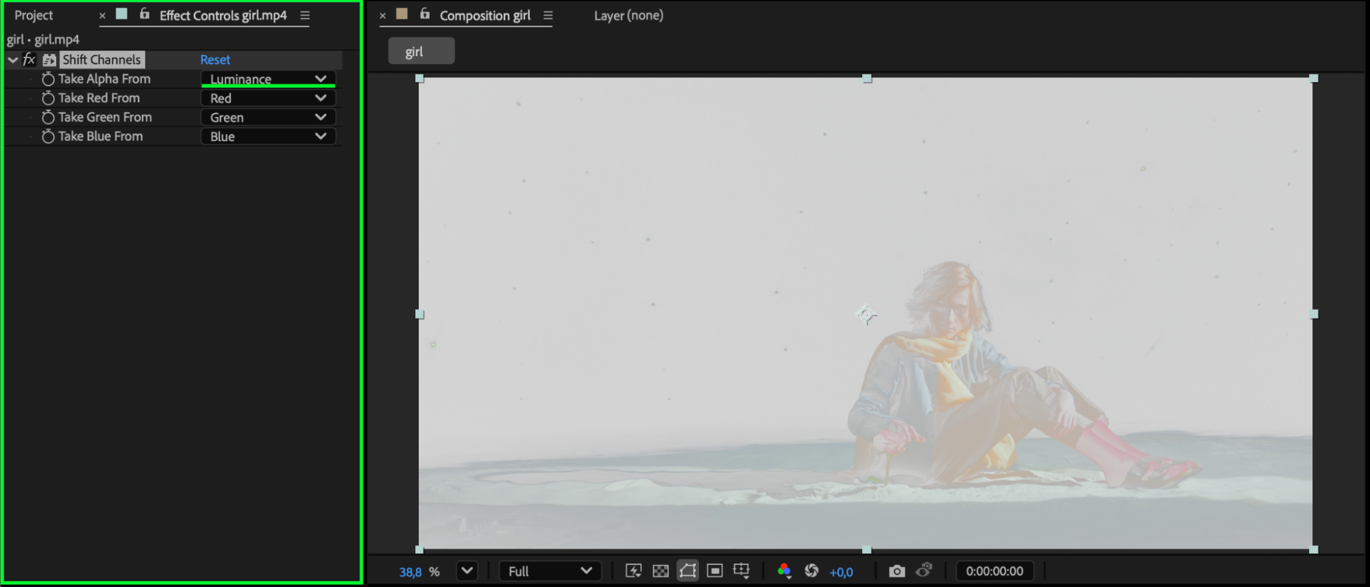Duplicate your footage, apply Shift Channels, and set Take Alpha From → Luminance. Then refine the matte by applying Auto Levels and Channel Combiner (e.g., converting luminance to saturation) to better separate bright and dark regions. This method provides deeper control compared to simple keying.