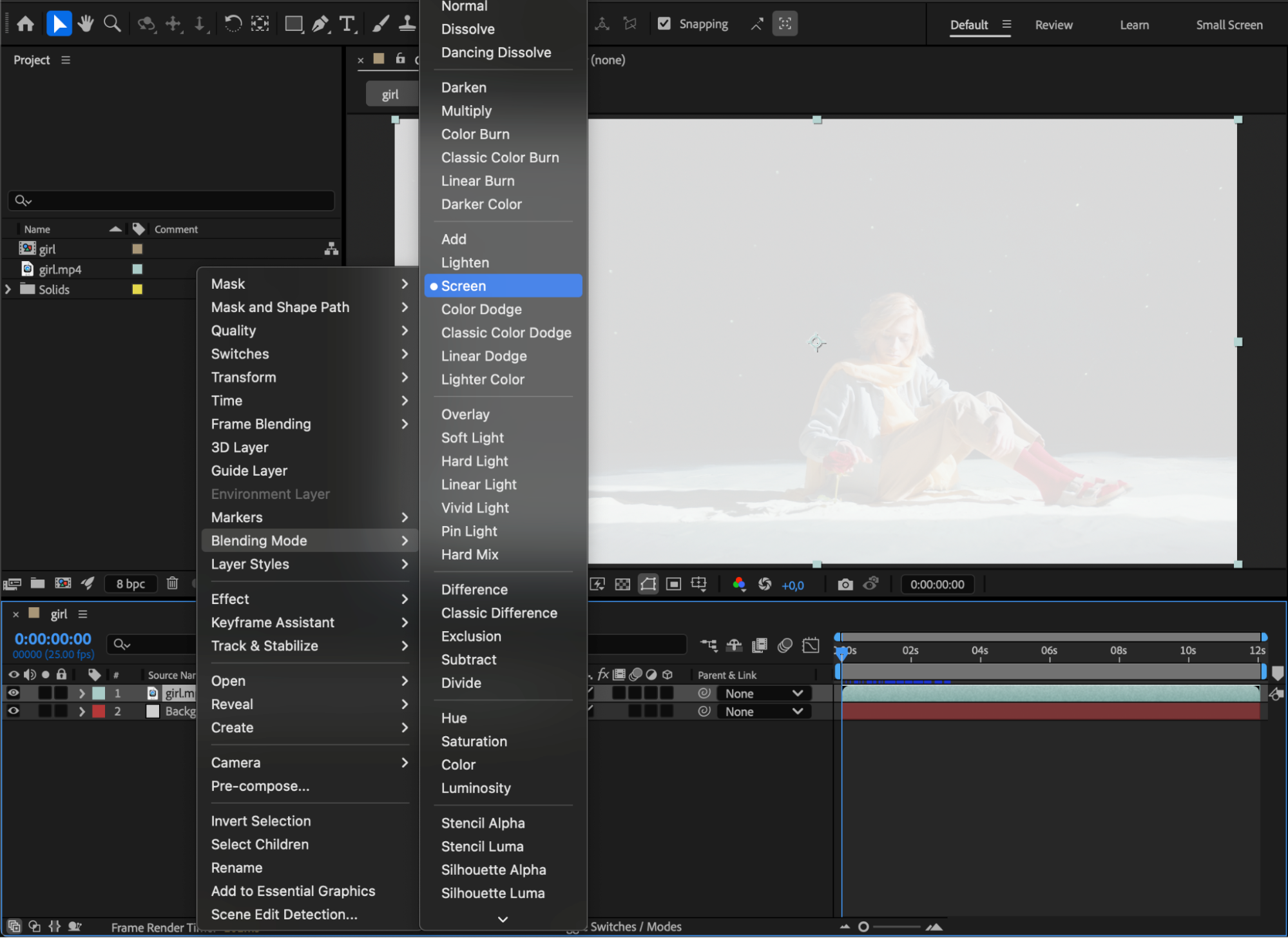 Place a white solid below your footage if needed, then select your layer and change the blend mode from Normal to Screen or Silhouette Luma. This instantly removes dark areas and keeps bright pixels visible, making it the quickest method for glows, flares, sparks, or any light-based elements.