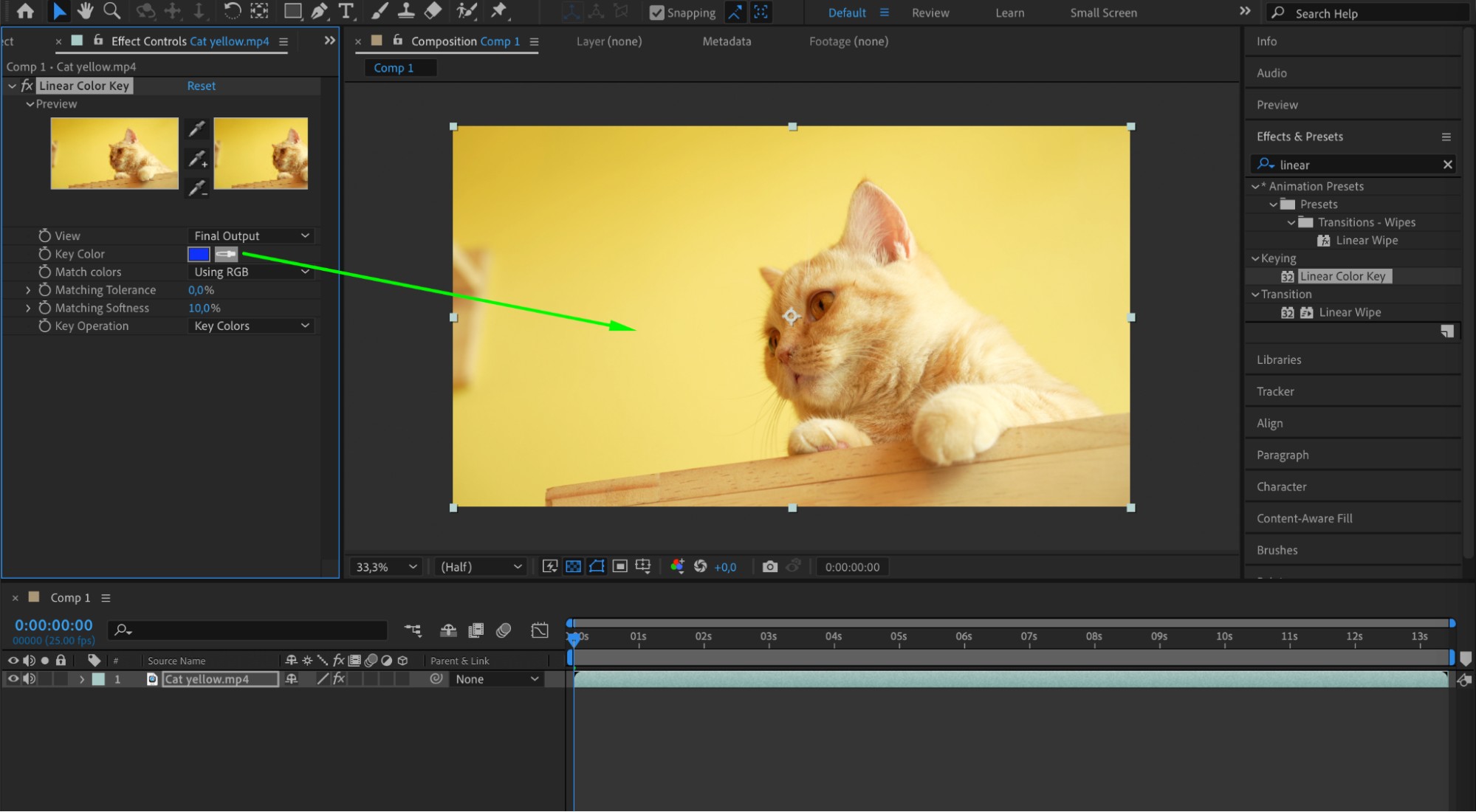 Select the video layer and navigate to the Effects & Presets panel. Search for the “Linear Color Key” effect and apply it to the layer. This effect aids in removing the background by keying out a specific color range.