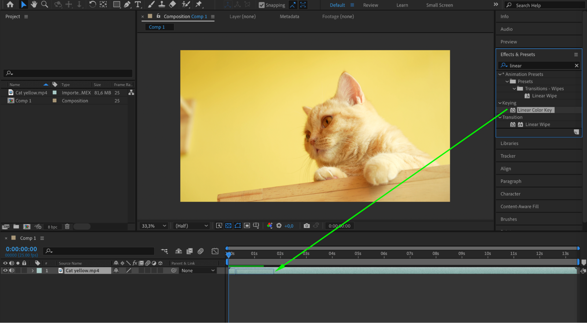 Select the video layer and navigate to the Effects & Presets panel. Search for the “Linear Color Key” effect and apply it to the layer. This effect aids in removing the background by keying out a specific color range.