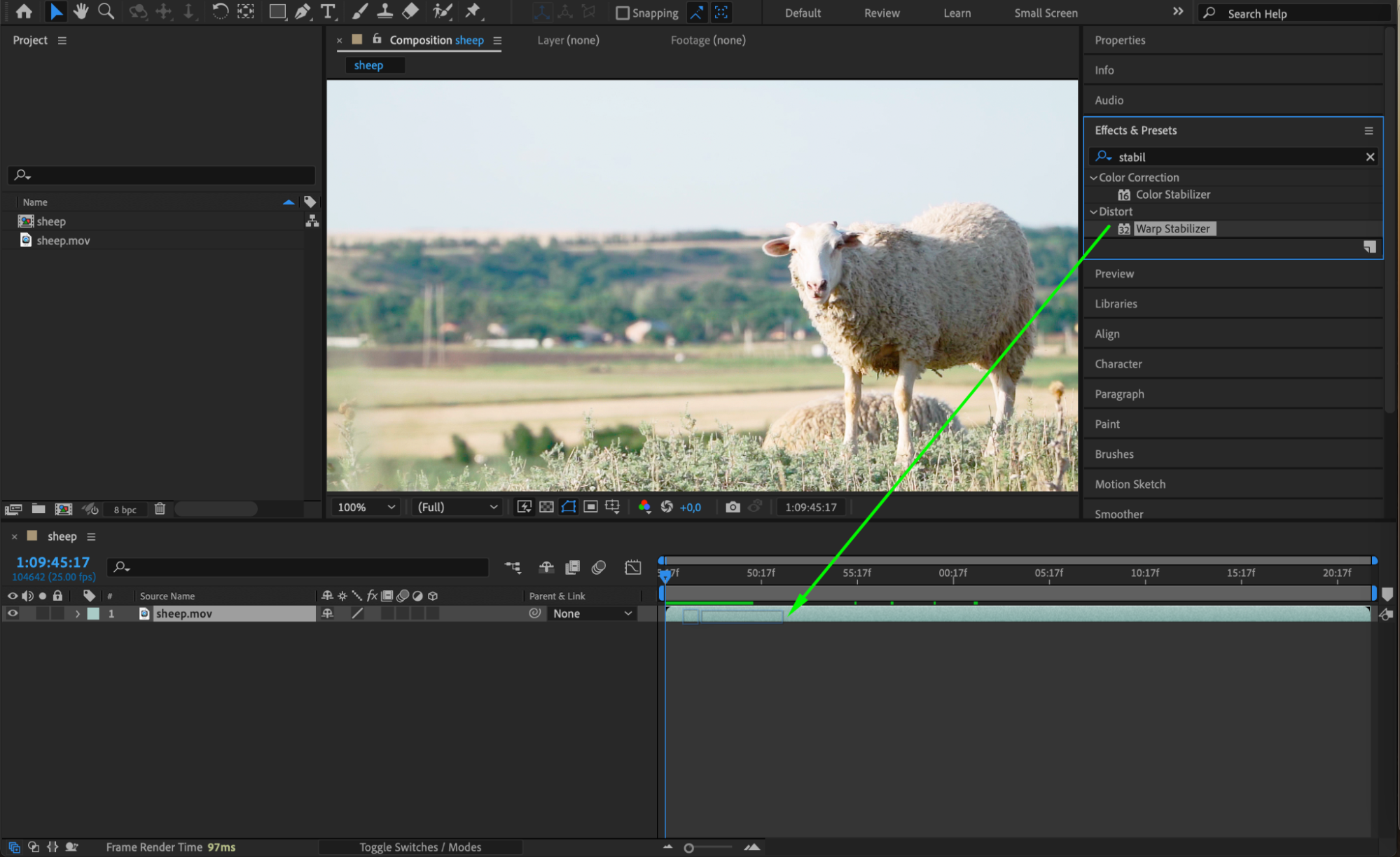 Now that your footage is in place, it’s time to apply the Warp Stabilizer effect. Go to the Effects & Presets panel, and in the search bar, type “Warp Stabilizer.” Drag and drop the Warp Stabilizer effect onto your footage layer. After applying the effect, After Effects will begin analyzing the footage for shake.