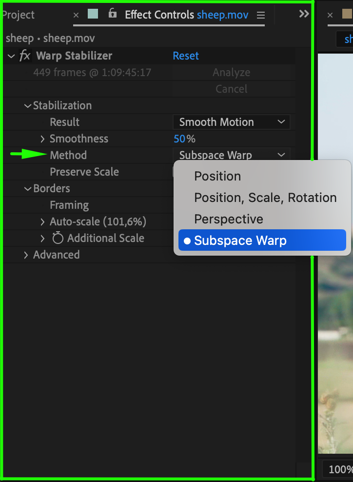 Step 3: Adjust Warp Stabilizer Settings