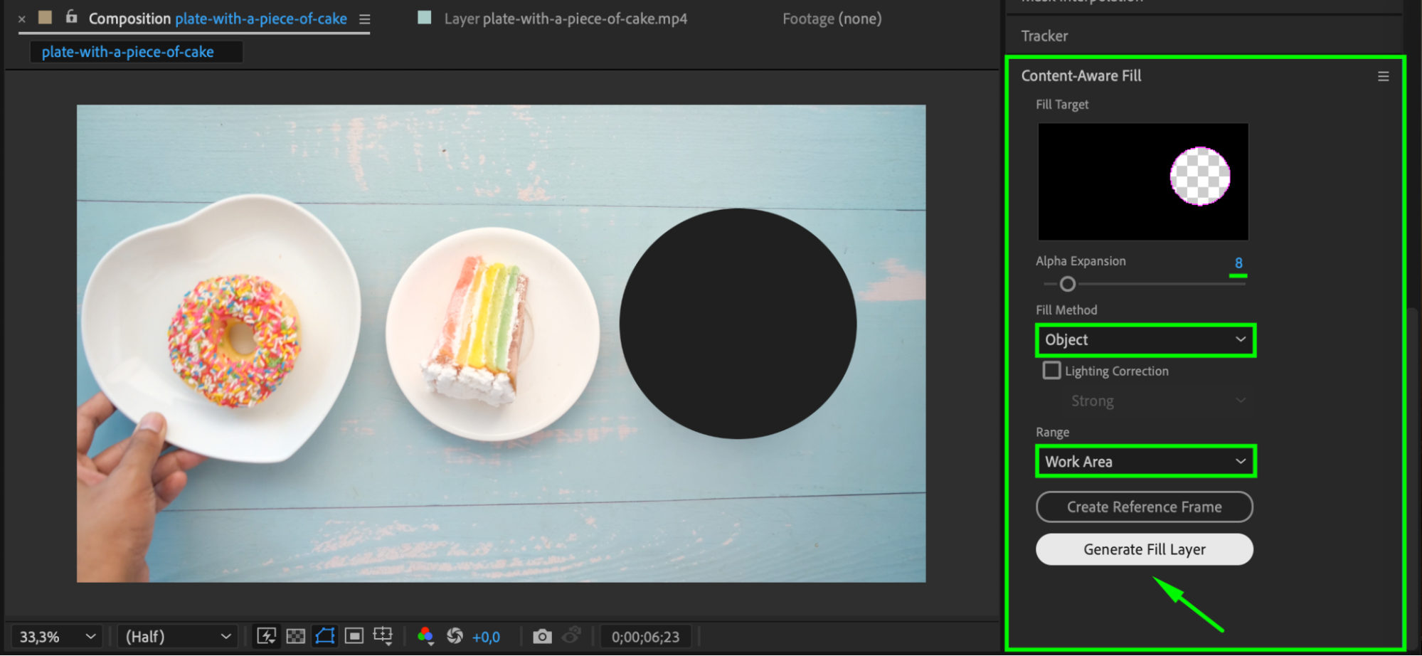 Once the mask is in place, it’s time to use the Content-Aware Fill feature. This tool allows After Effects to automatically fill in the area left behind after you remove the object. With your footage layer selected and the mask applied, go to Window > Content-Aware Fill. In the Content-Aware Fill panel, choose the Fill Method that best fits your scene, such as “Object”. Click Generate Fill Layer, and After Effects will analyze the footage and generate a new layer with the object removed.