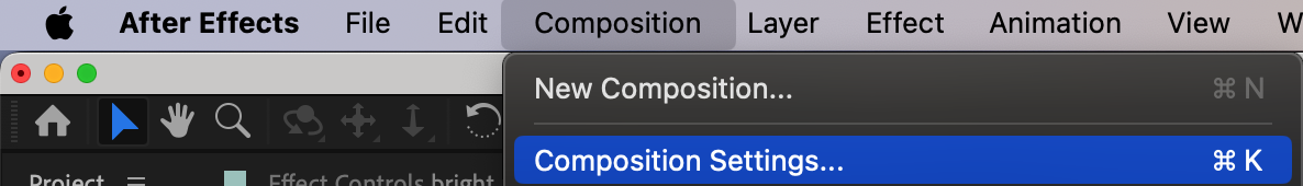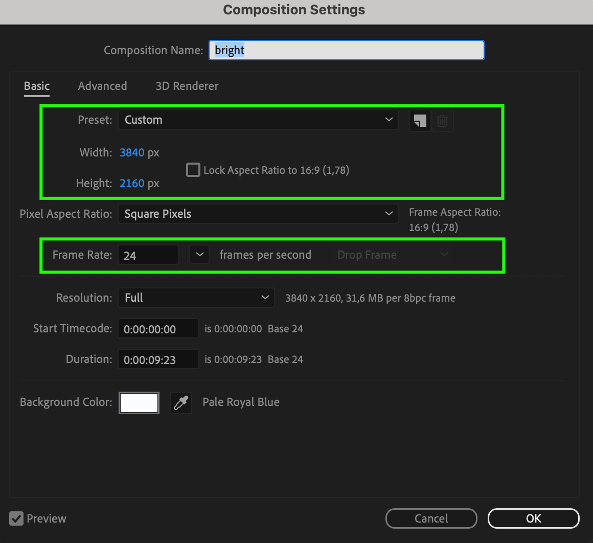 1. Set up the composition: Review your composition settings and adjust the resolution and frame rate settings according to your project requirements. Typically, standard settings include resolutions of 1920×1080 (Full HD) or 3840×2160 (4K), and frame rates of 24, 30, or 60 frames per second.