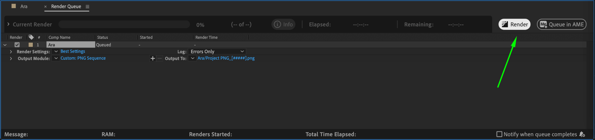 Once all your settings are configured, click on the Render button in the Render Queue panel. After Effects will begin rendering each frame of your composition as a separate PNG file, saving them to the location you specified in Step 4. Depending on the length of your composition and the complexity of your layers, this process might take some time.