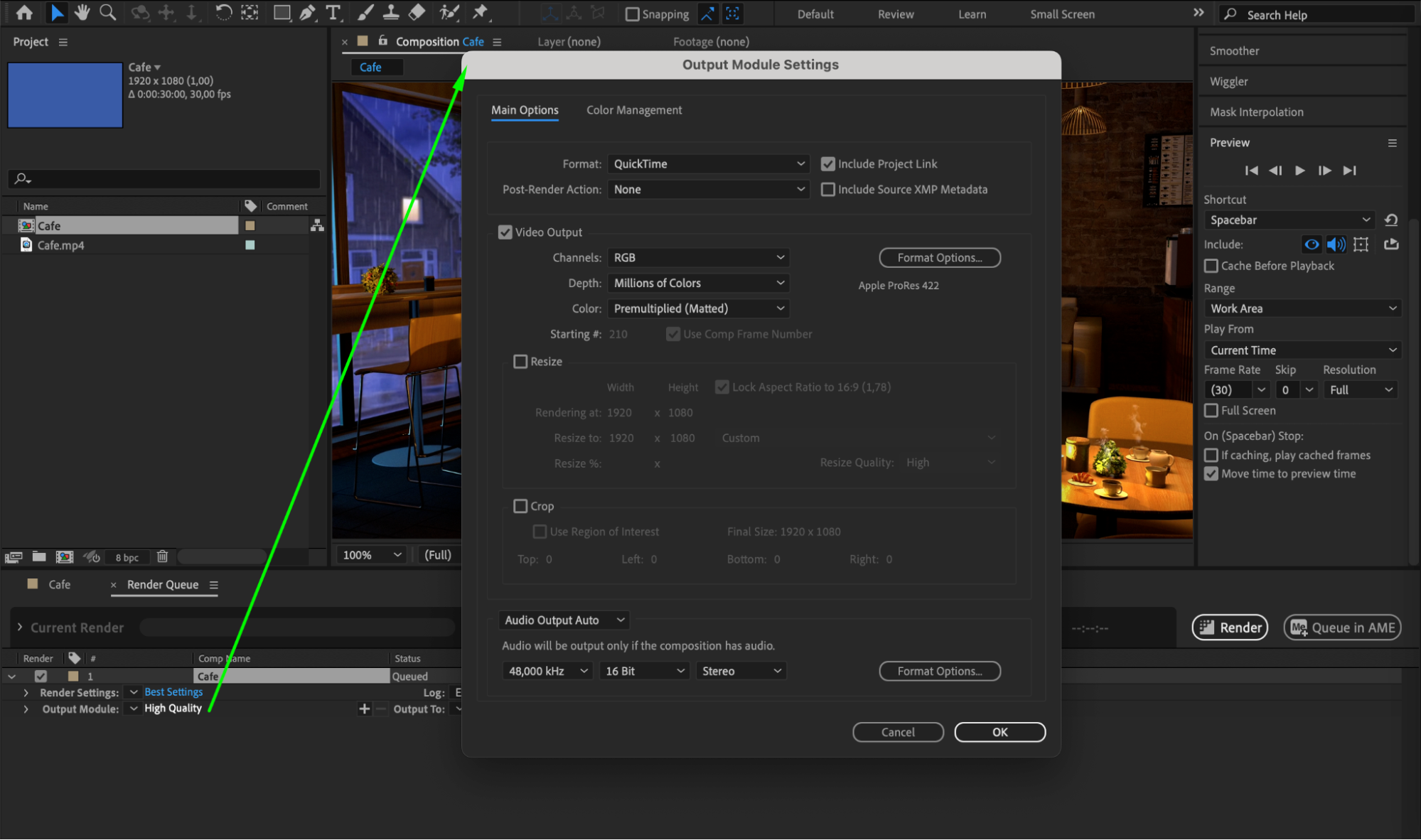 Output Modules determine the format and codec of your rendered file. Click “Output Module” in the Render Queue panel to select the desired format and codec. Use widely compatible formats like MP4 or MOV and efficient codecs like H.264 or Apple ProRes 422 for optimal playback.