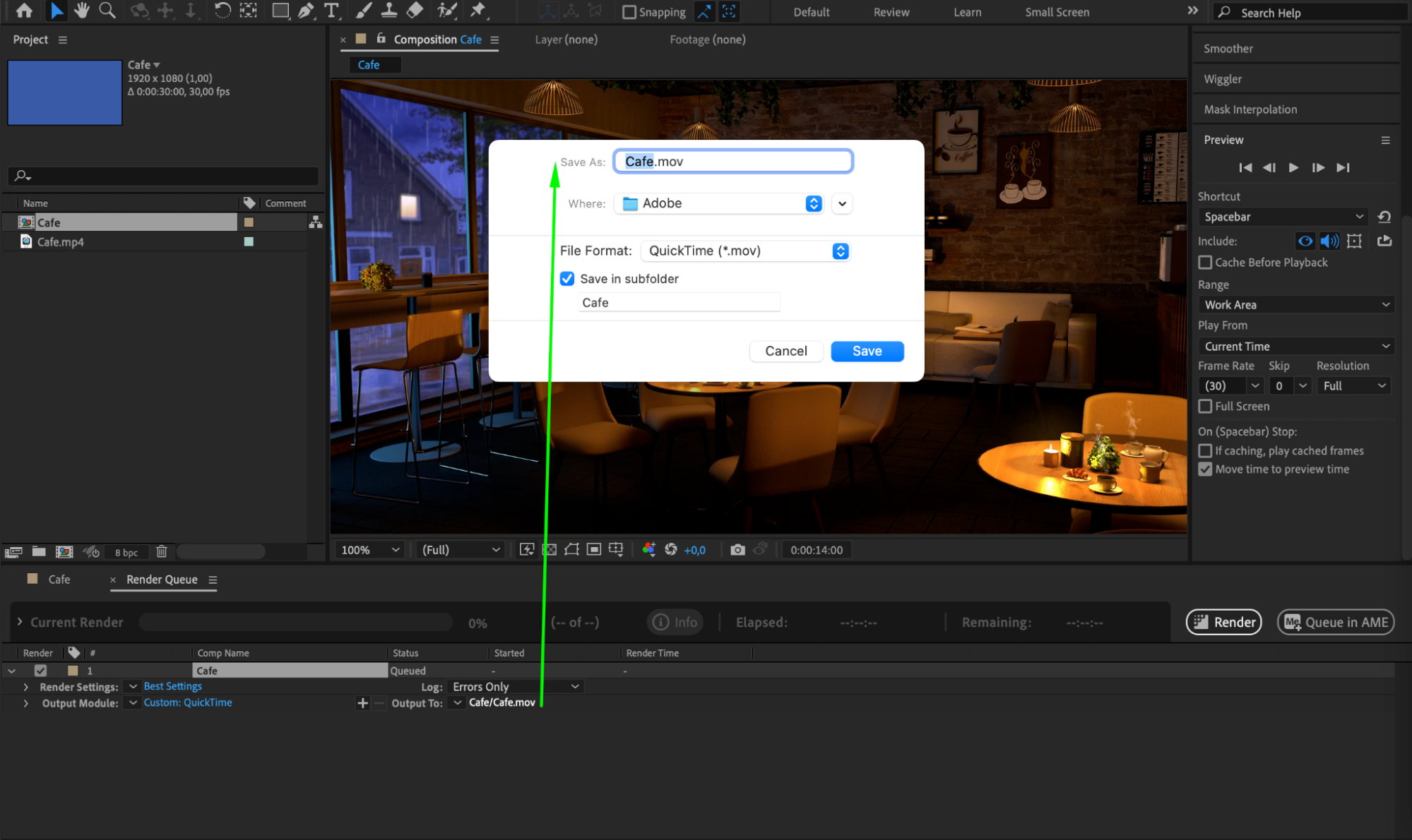 Choose where to save the rendered file by clicking “Output To” in the Render Queue panel. Select a folder or specify a custom path on a reliable hard drive to avoid data loss or corruption.