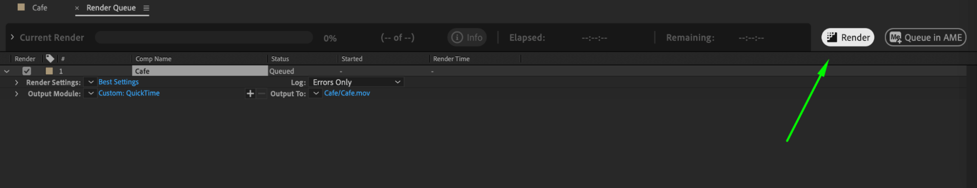 Once all settings are configured, click “Render” in the Render Queue panel to start rendering. Monitor progress in the Status column. Depending on project complexity and settings, rendering may take time. Let the process run uninterrupted for best results.