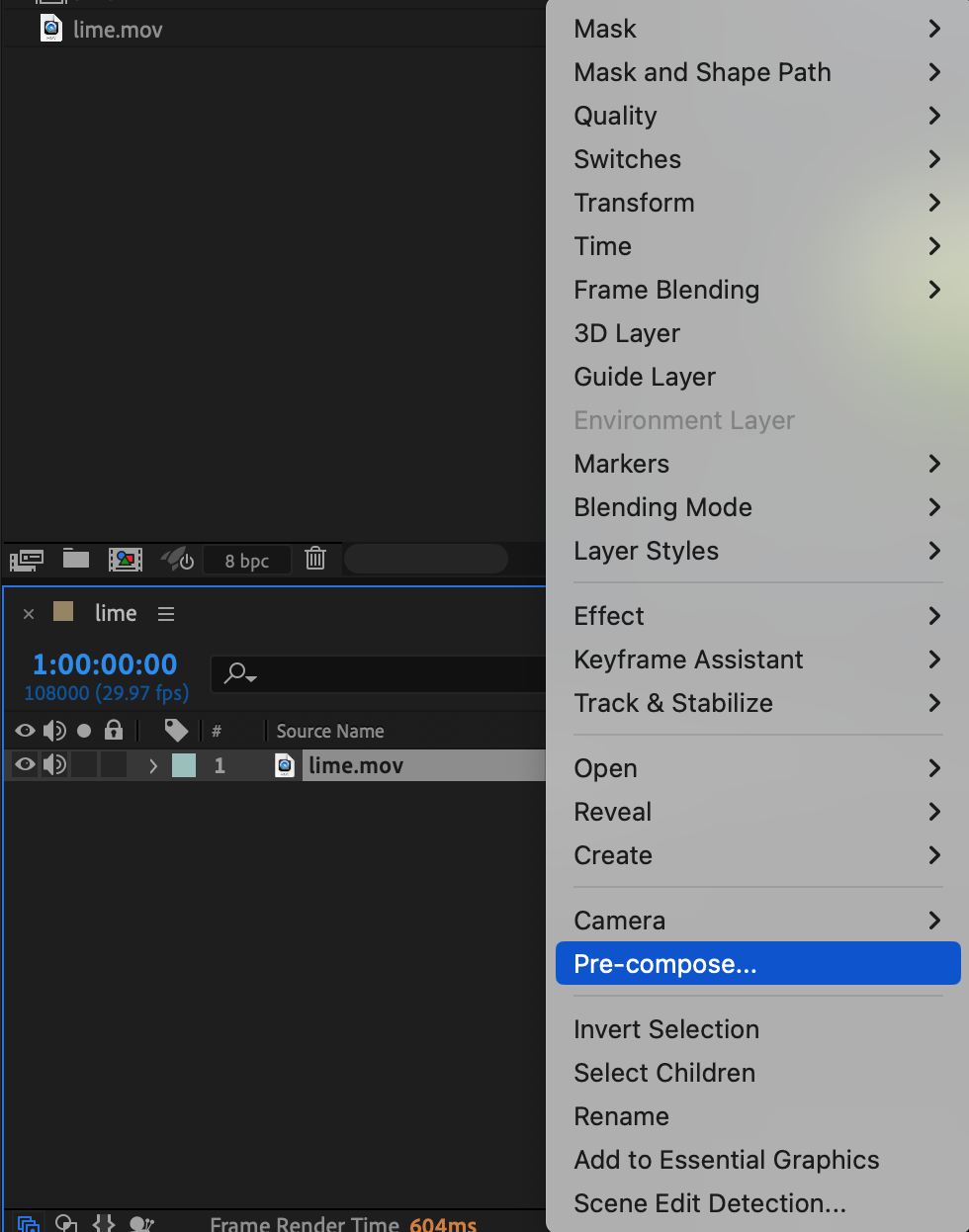 Select all layers within your composition to group them into one pre-composition. Right-click on the selected layers, and choose Pre-compose or navigate to Layer > Pre-compose. This step combines all the individual layers into one layer, making it easier to duplicate and repeat the sequence.