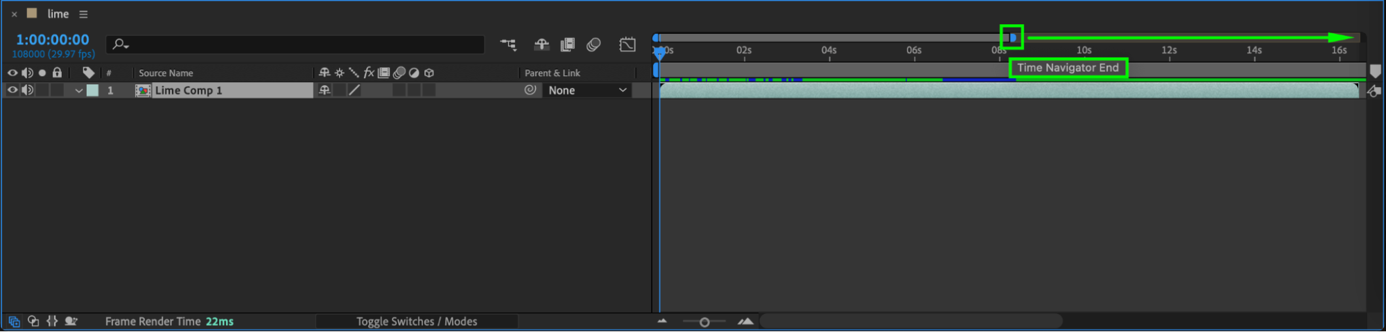 In the Timeline panel, extend the Time Navigator End to match the new length of the composition. This ensures the entire extended timeline is visible, making it easier to manage and view the duplicated sequences.