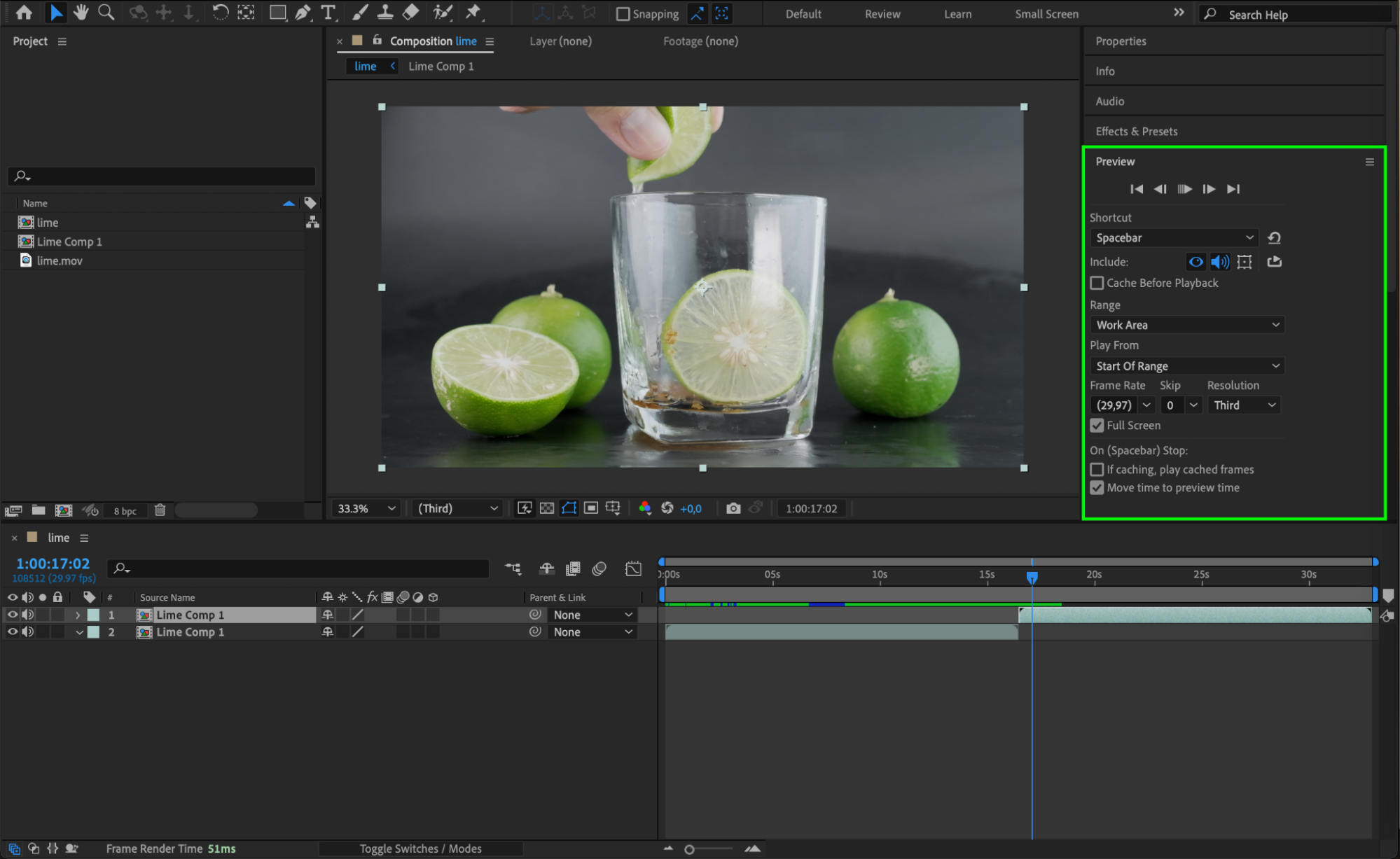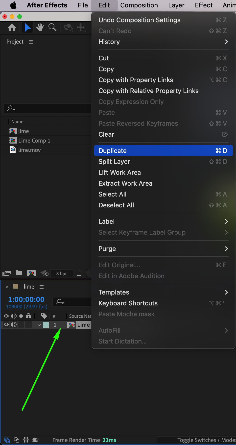Select the pre-composition layer in the timeline and press “Ctrl/Cmd + D” to duplicate it. The duplicated composition will appear directly above the original in the timeline, ready to be repositioned for repeating. Move the duplicated pre-composition along the timeline to start immediately after the original ends.