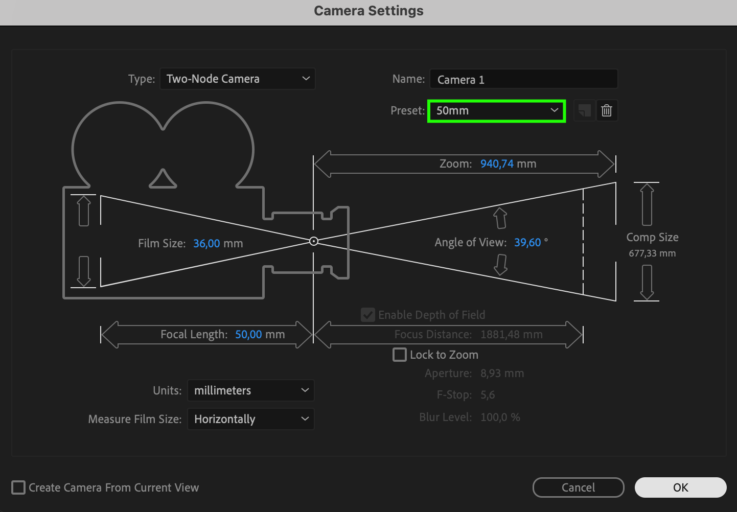 Go to the Layer menu at the top, then choose New > Camera. In the Camera Settings window, you can select a preset like 50mm or create your own custom settings. Click OK to create the camera layer.