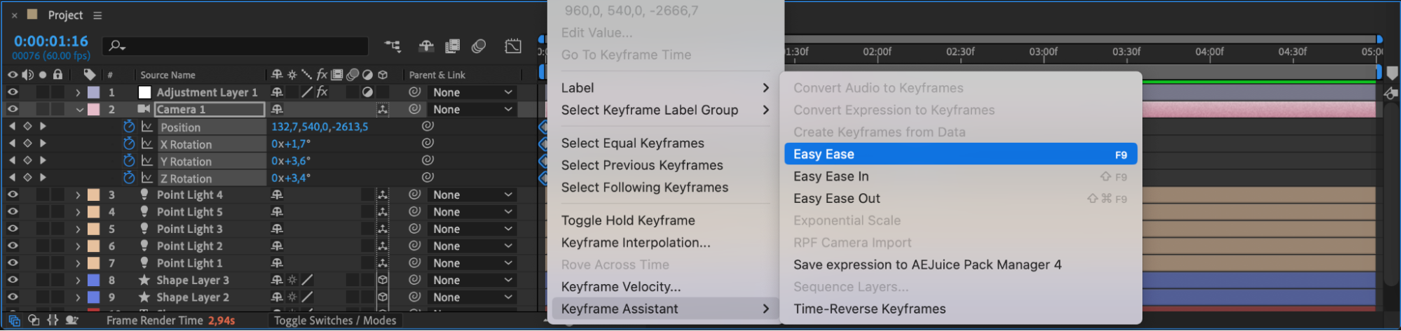 To make your camera animation smoother and more natural, select your keyframes. Right-click and choose Keyframe Assistant > Easy Ease, or simply press F9. This will create a more fluid and professional-looking motion.