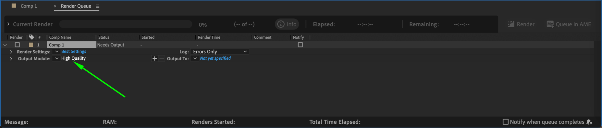 In the Render Queue panel, you’ll find the Output Module section. Here, you’ll see a list of available output formats. Click on the linked text next to Output Module to access the settings.