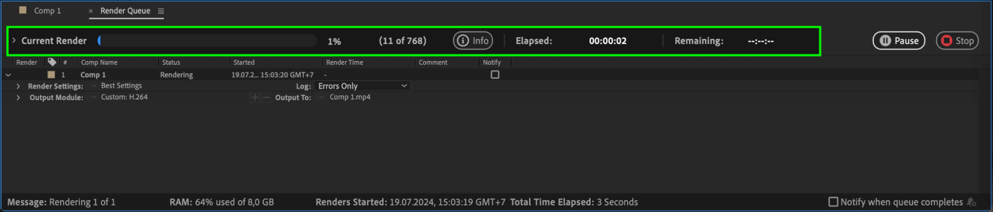While After Effects renders your composition, you can monitor the progress in the Render Queue panel. You’ll see a status bar and an estimated remaining time. Depending on the complexity of your project and the settings you’ve chosen, this process can take some time.