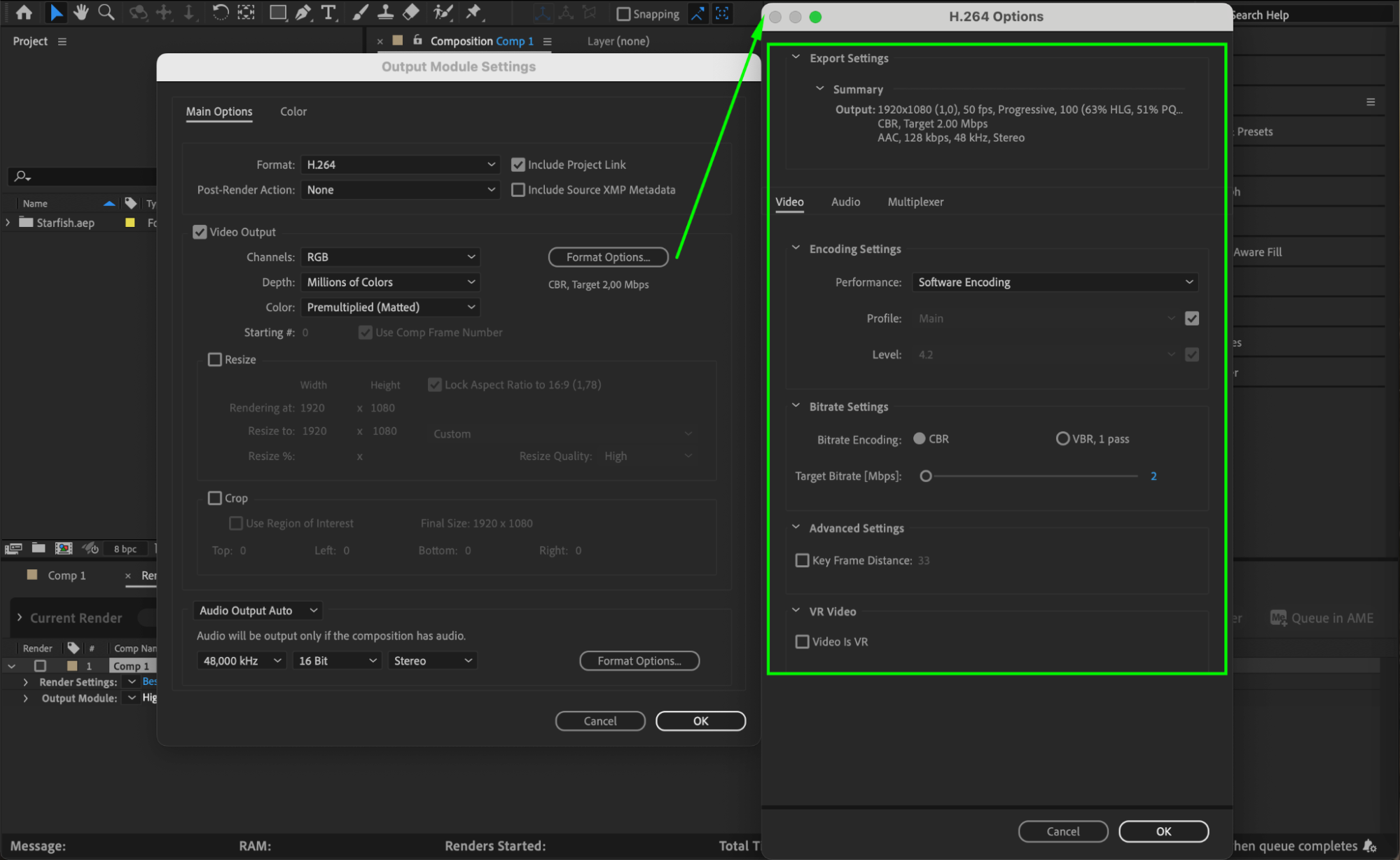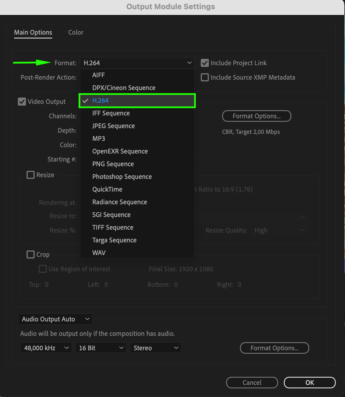 Within the Output Module settings, you’ll find a wide range of formats to choose from. Scroll through the list and select “H.264” as the format. This format offers good compression while maintaining high-quality video output. Plus, it’s widely supported on different devices and platforms.