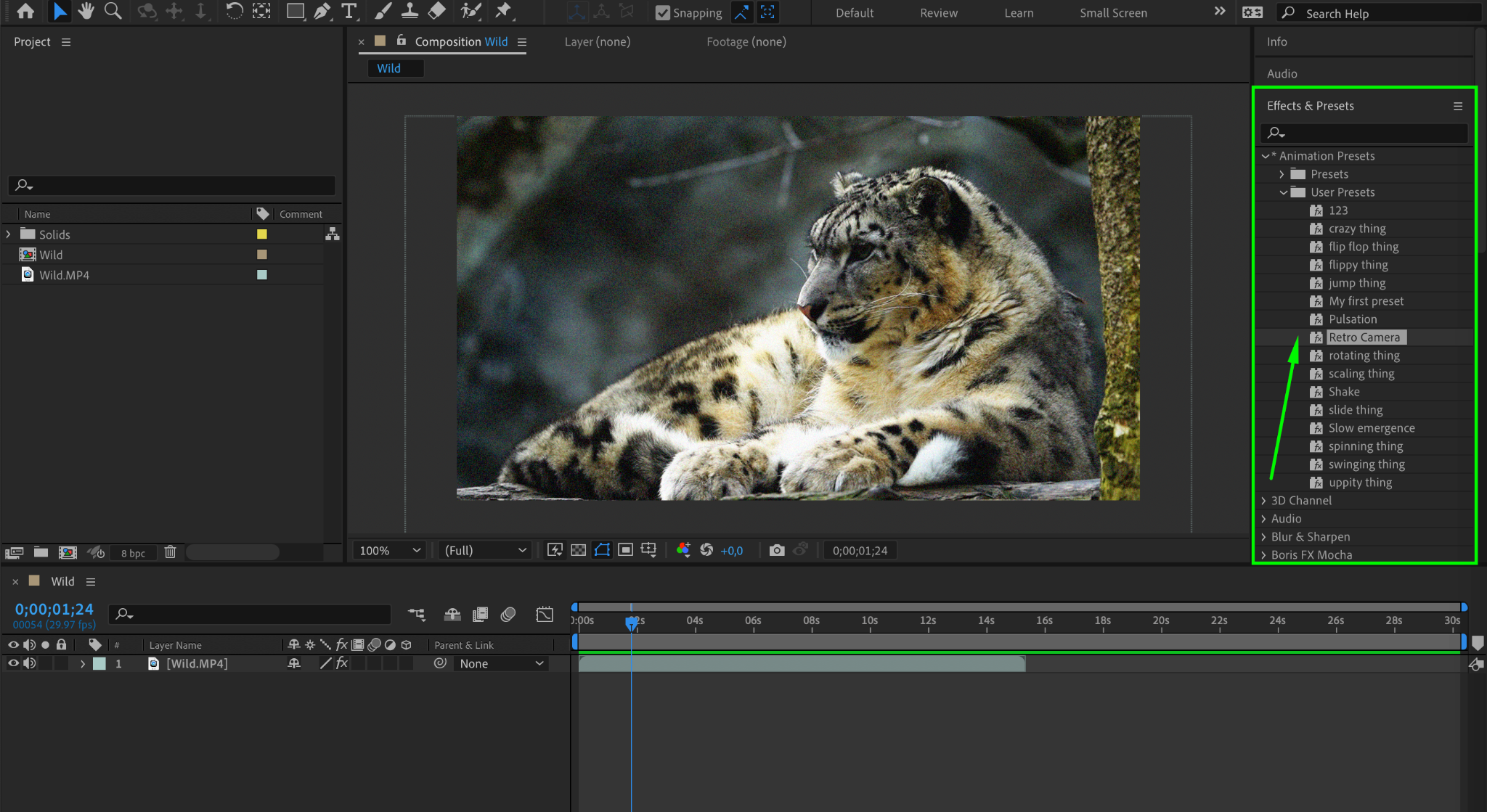 After naming your preset and choosing a destination, click on the “Save” button to save your animation preset. It’s a good idea to organize your animation presets into folders for easy access and management. By categorizing them into folders, you can quickly locate and apply the desired animation preset whenever you need it. After saving, you can easily find your preset in the Effects & Presets panel.