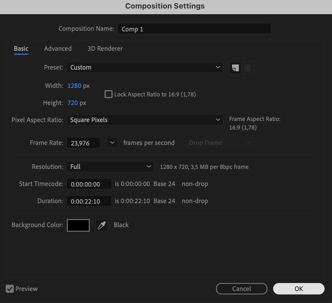 1. Specify the Composition Settings: