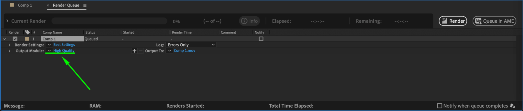 In the Render Queue panel, click on the text beside Output Module to open the Output Module Settings. Here, you can choose the MP4 format (H.264) and adjust the bitrate, quality, and other settings according to your preferences.