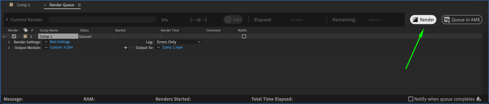Click on the “Render” button in the Render Queue panel to start the rendering process. After Effects will begin rendering your composition and converting it into an MP4 file.