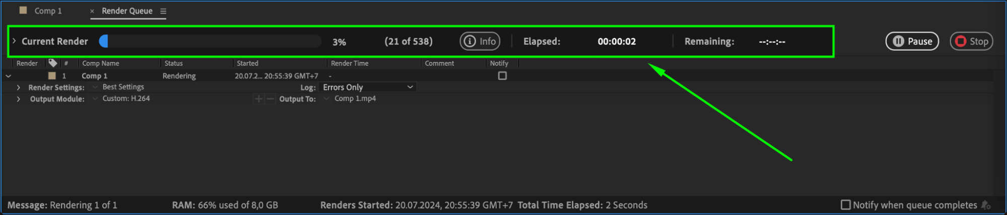 You can monitor the progress of the render in the Render Queue panel. A status bar will show you the progress of the rendering. Depending on the complexity and length of your composition, the rendering process may take some time.
